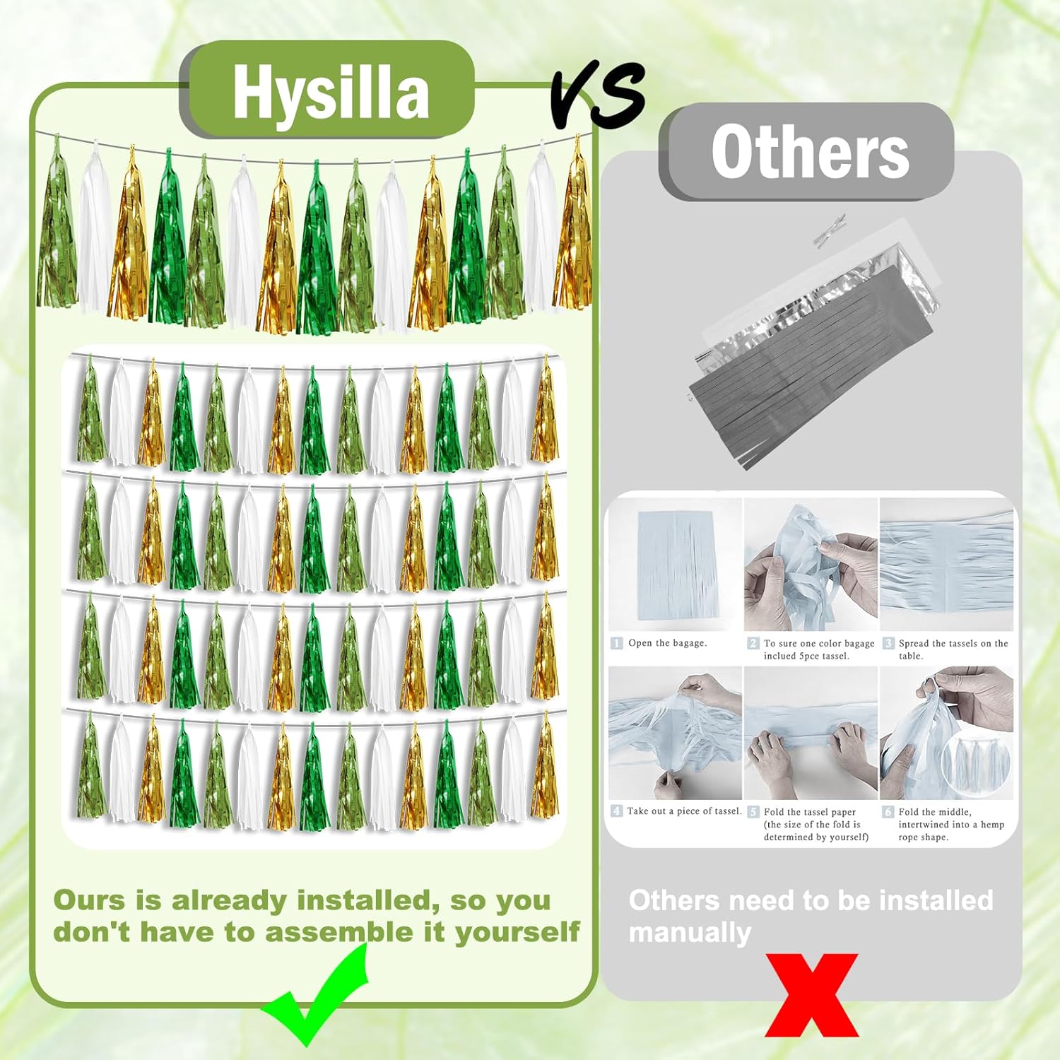 - 【Light Green White Gold Green Party Supplies Set】: The total length of the Light Green White Gold Green birthday tassels banner is 59 feet, divided into 6 strips, each 9.8 feet long. Each banner contains 15 tassels, and each tassel measures 14 inches, for birthday decorations many occasions, and so on
