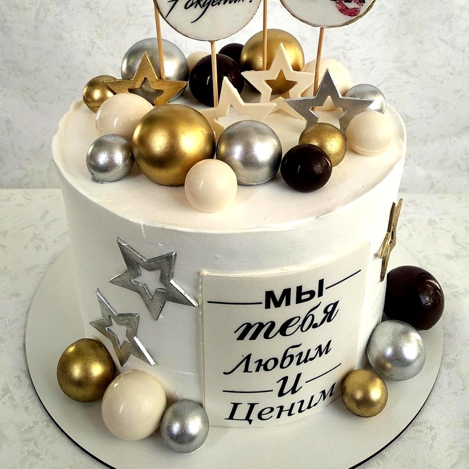 - Package includes: 32 pcs balls cake decorations with different colors and sizes. They are gold, black, silver colors as picture showed. Silver and black are 8, and the remaining 16 are gold.