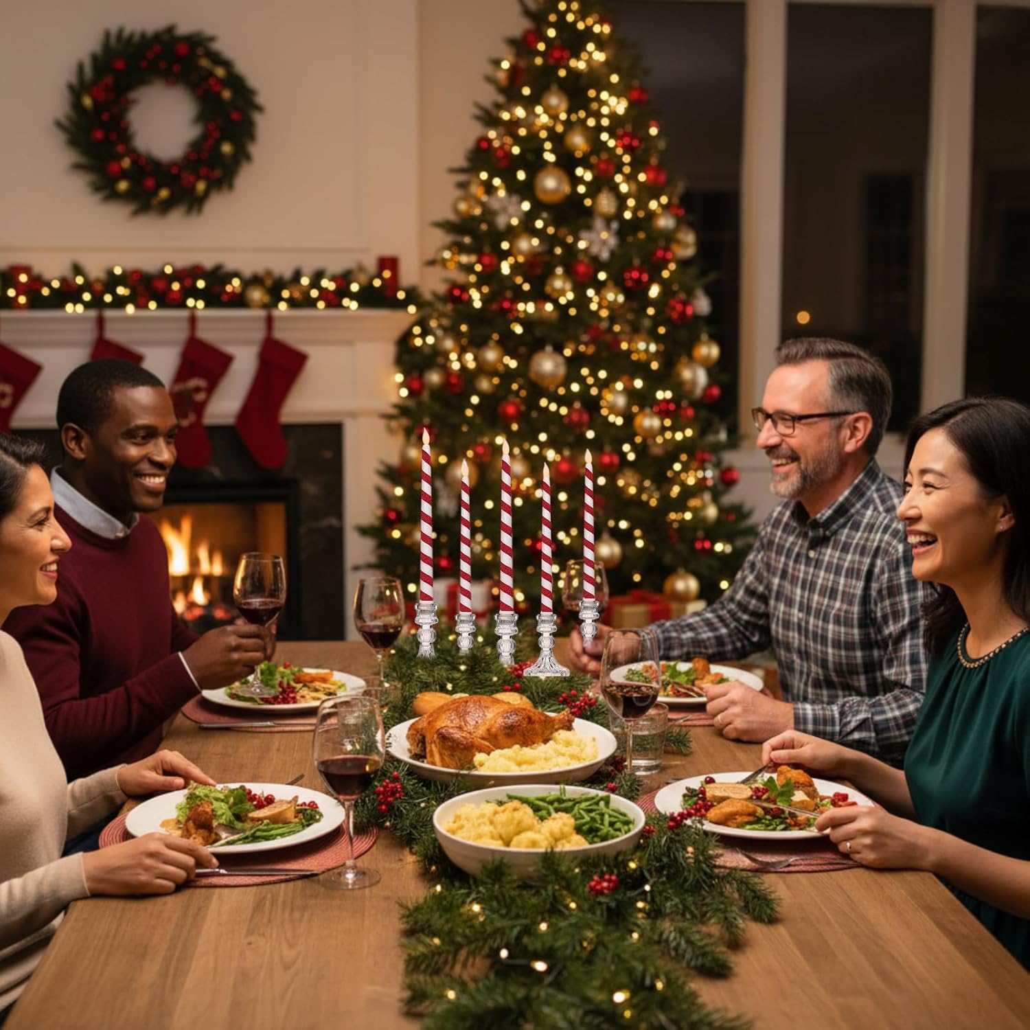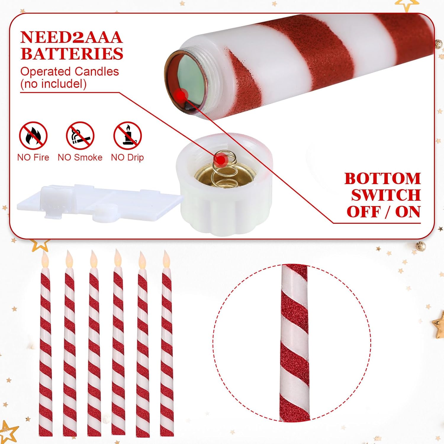 - Christmas Candles Set: comes with 6 pcs candy cane theme flameless taper candles; Each flameless candlestick operated by 2 AAA batteries (not included), Please note that the set does not include a remote control or candle bases
