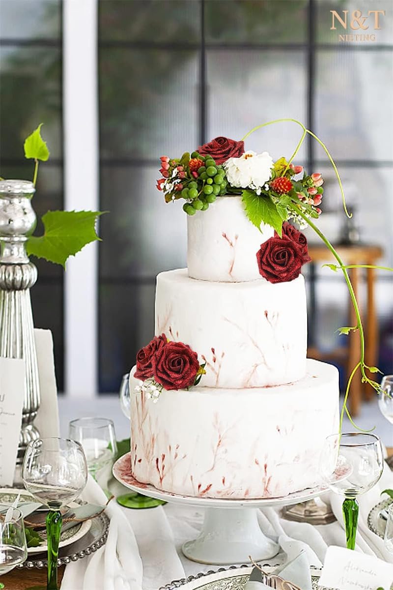 N&T NIETING Artificial Flowers Glowing Red Flowers Foam 25pcs Glitter Roses Real Looking Fake Roses with Stem for DIY Wedding Bouquets Centerpieces Bridal Shower Party Home Decorations