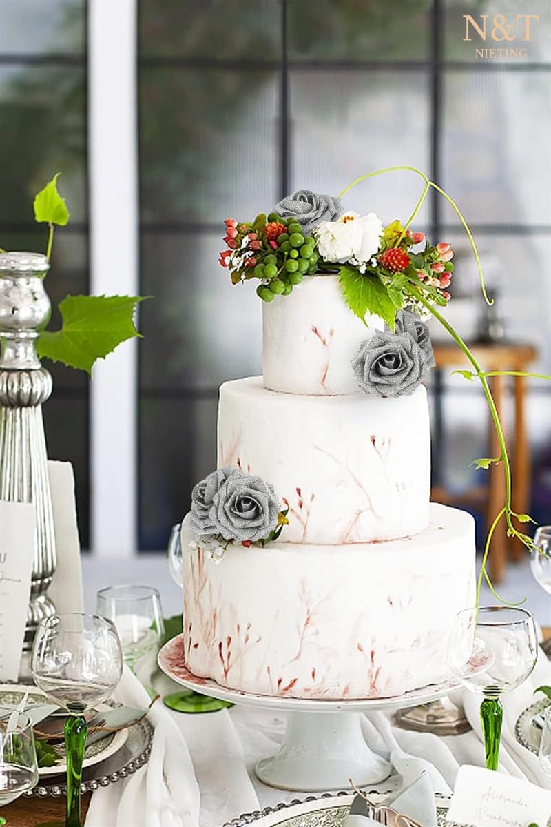 N&T NIETING Artificial Flowers Glowing Silver Flowers Foam 25pcs Glitter Roses Real Looking Fake Roses with Stem for DIY Wedding Bouquets Centerpieces Bridal Shower Party Home Decorations