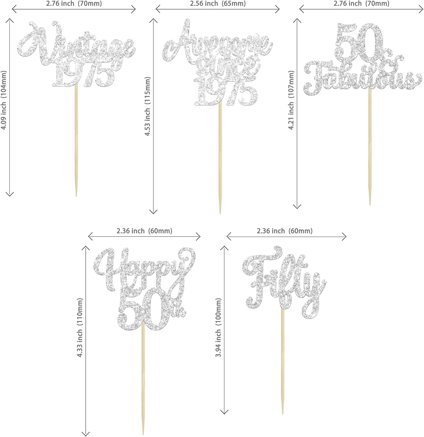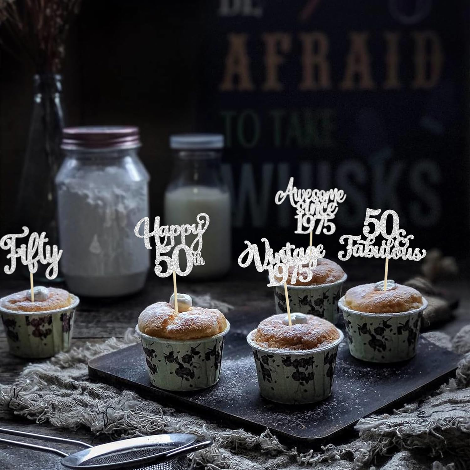 30Pcs Happy 50th Birthday Cupcake Toppers Glitter Fifty Vintage 1975 Cupcake Picks Cheers to 50 Fabulous Cake Decorations for 50th Birthday Wedding Anniversary Party Supplies Silver