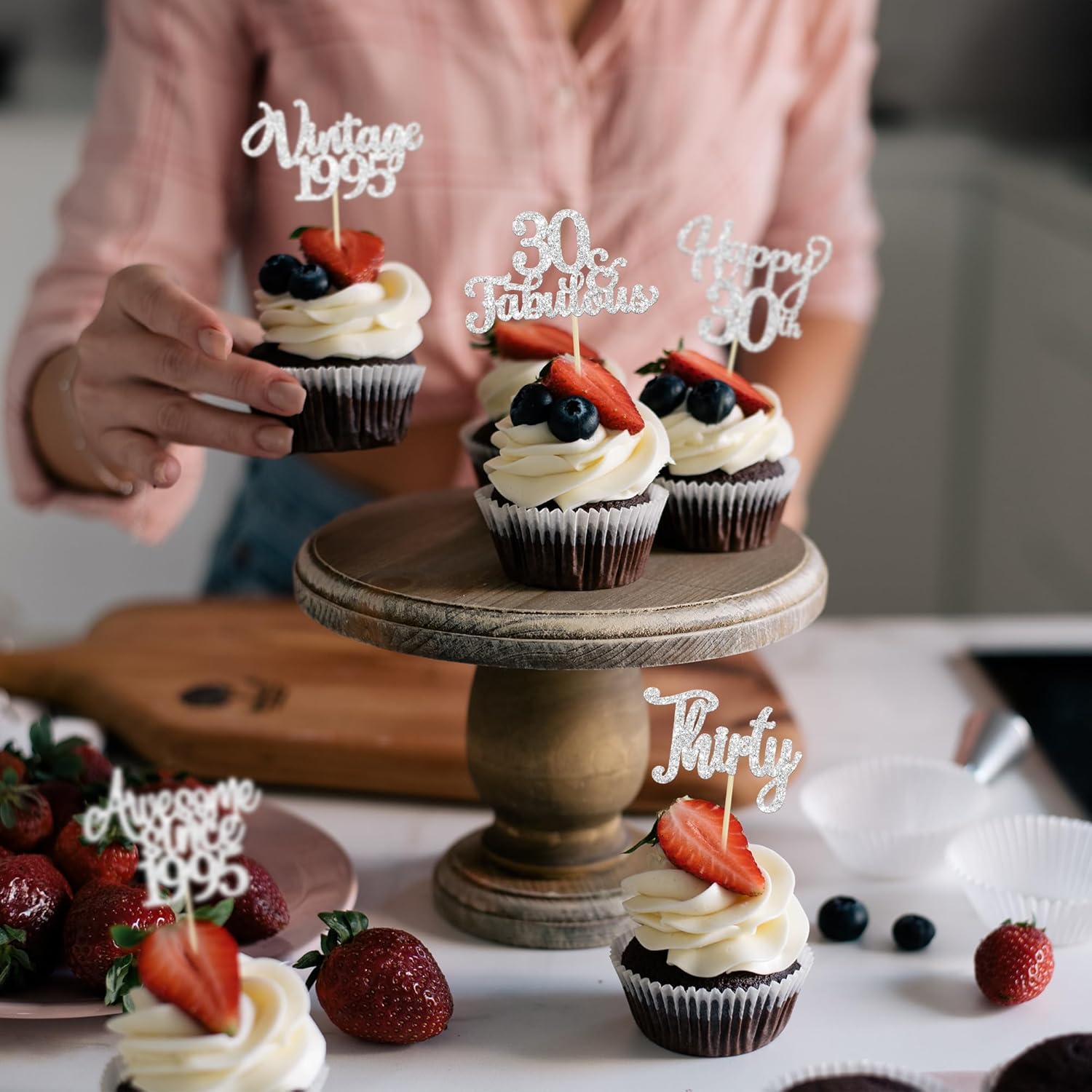 30Pcs Happy 30th Birthday Cupcake Toppers Glitter Thirty Vintage 1995 Cupcake Picks Cheers to 30 Fabulous Cake Decorations for 30th Birthday Wedding Anniversary Party Supplies Silver