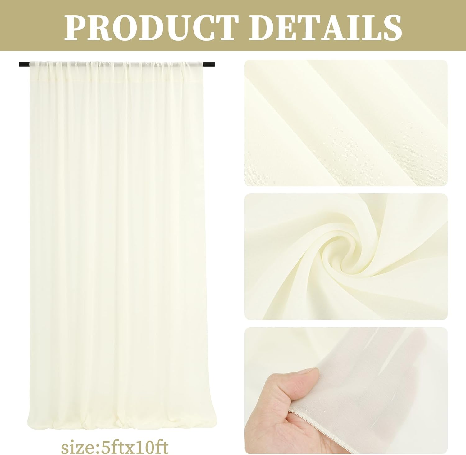 - đ¸ăChiffon Fabric CurtainăThe package will include 6 panels ivory wedding drape curtain, each wedding extra long curtain measures 5 feet(60inch)wide x10 feet(120inch) long. Sufficient quantity can meet your needs. These backdrop curtains are applicable for any indoor and outdoor occasion either for decorative or functional uses.(Tips: There is no hook or circle in the package)