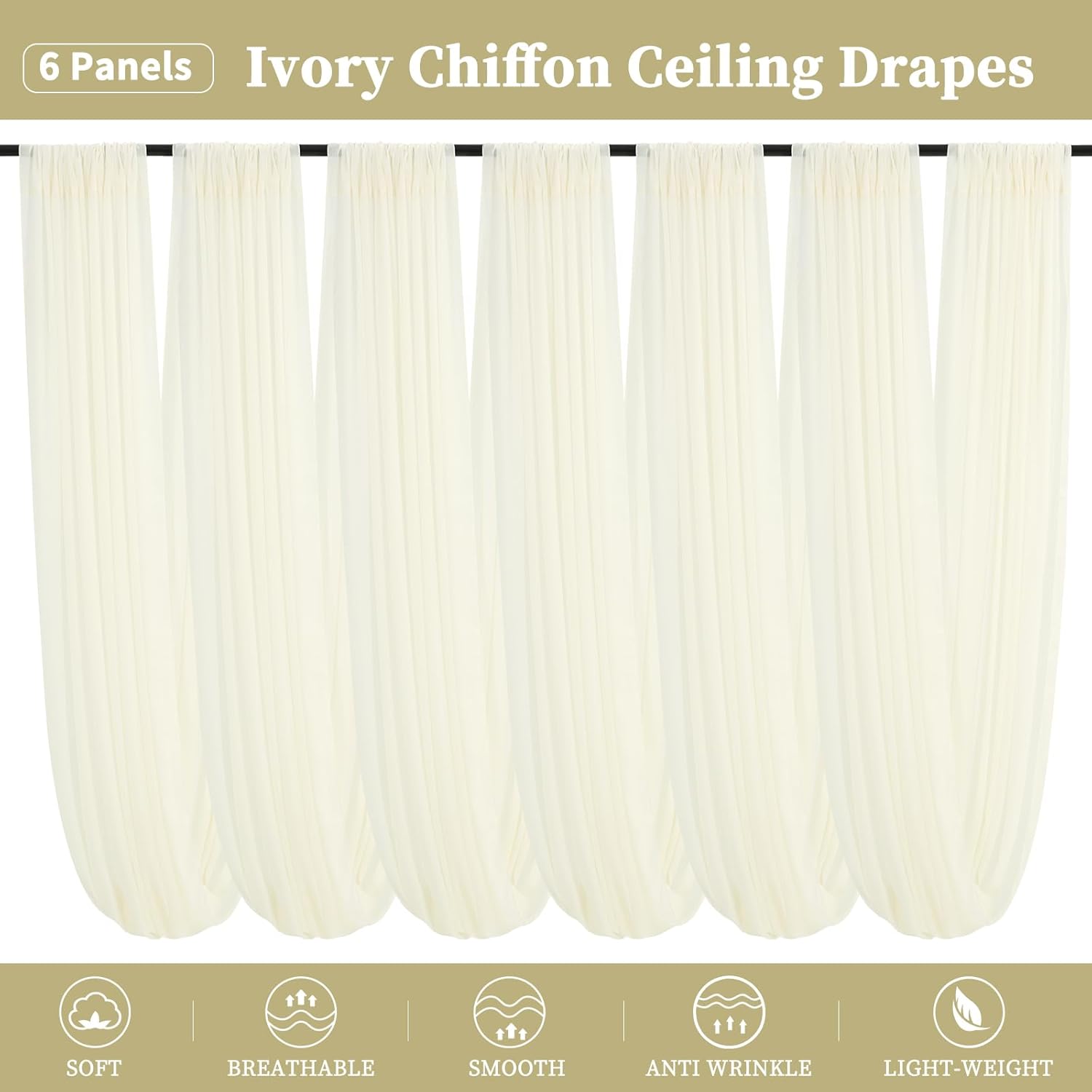 6 Panels Ivory Ceiling Drapes for Wedding 5ftx10ft Chiffon Fabric Arch Draping Curtains Sheer Drapery for Party Ceremony Birthday Baby Shower Reception Stage Swag Ceiling Decorations