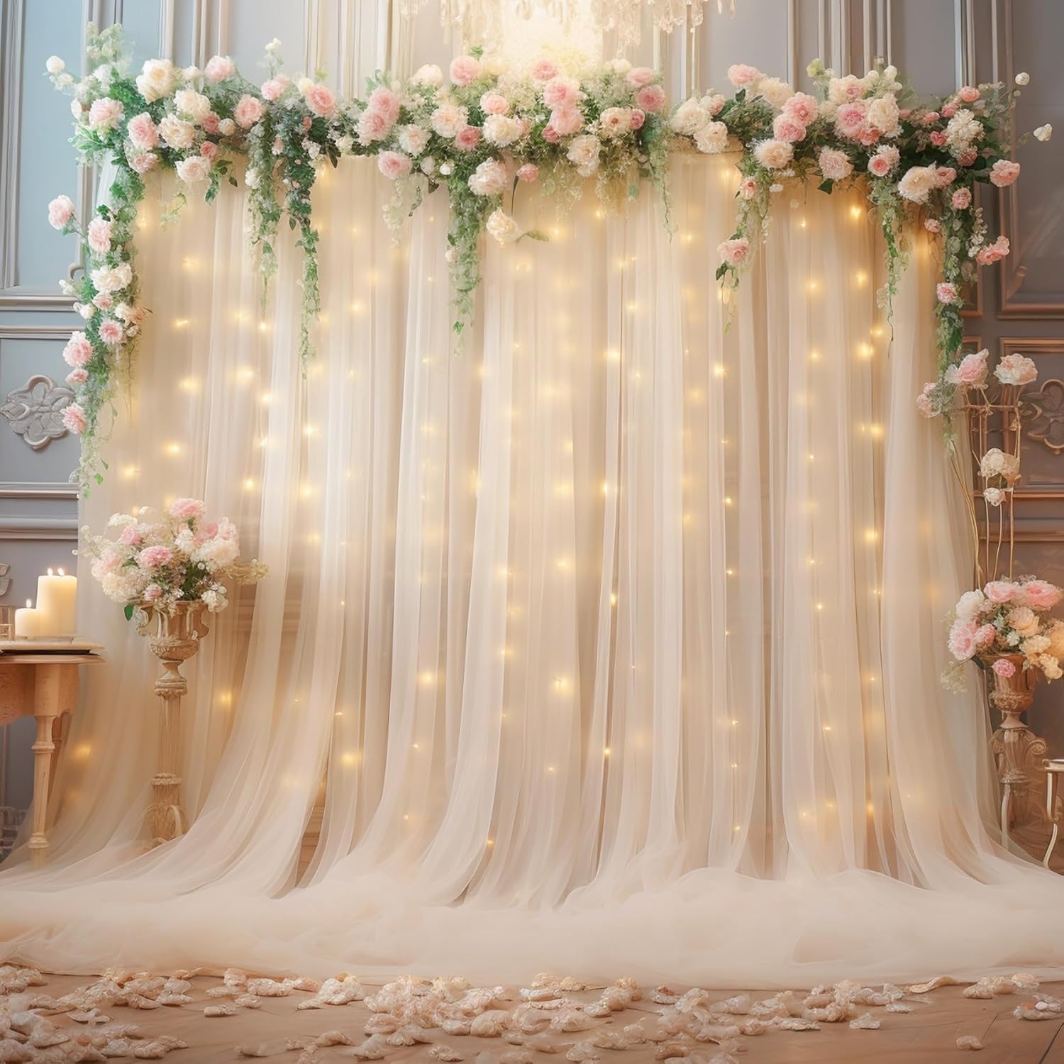- 【Elegant Sheer Draping Fabric】Our champagne backdrop curtain are crafted from high-quality delicate soft and smooth tulle.The fabric is so dreamy. It's like a semi sheer dress that flows in the wind, so romantic. And it's also lightweight to wear, the wind was able to blow it for a dramatic effect.