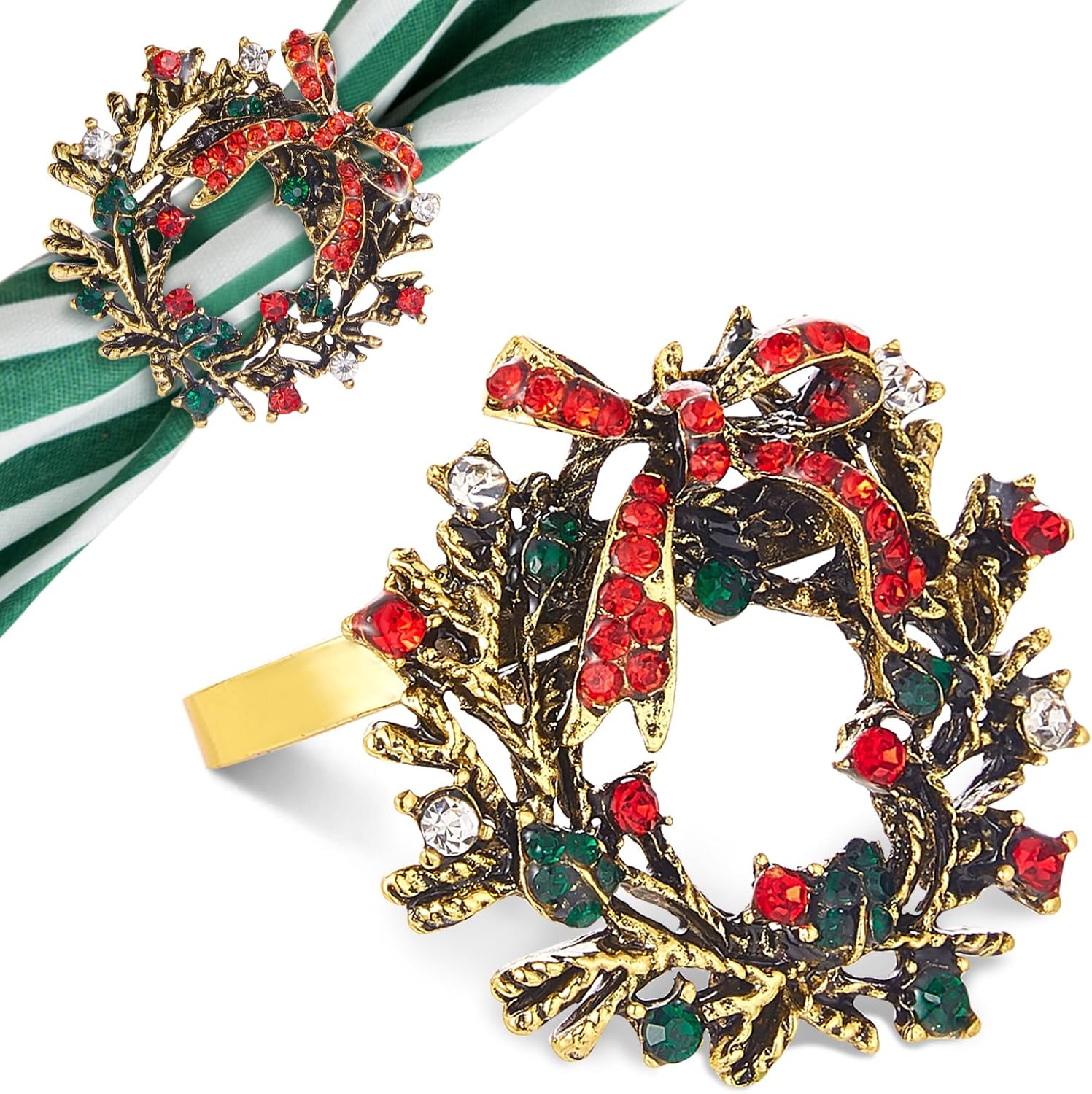 - Sturdy Material & Beautiful Design: These adorable Xmas napkin rings are made of metal which are sturdy and durable. Sparkling red, white, and green rhinestones are set in metal branches surrounding a bow encrusted with red rhinestones. They shine in the light and add an elegant splash of color to your table.