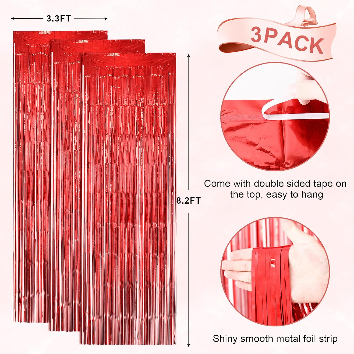 - Package Included: 3 packs of foil fringe curtains, the size of the foil curtain is 3.3*8.2 ft. It's long enough to fit any occasion. Please do not stick the foil curtain on uneven or stained walls to prevent it from falling off