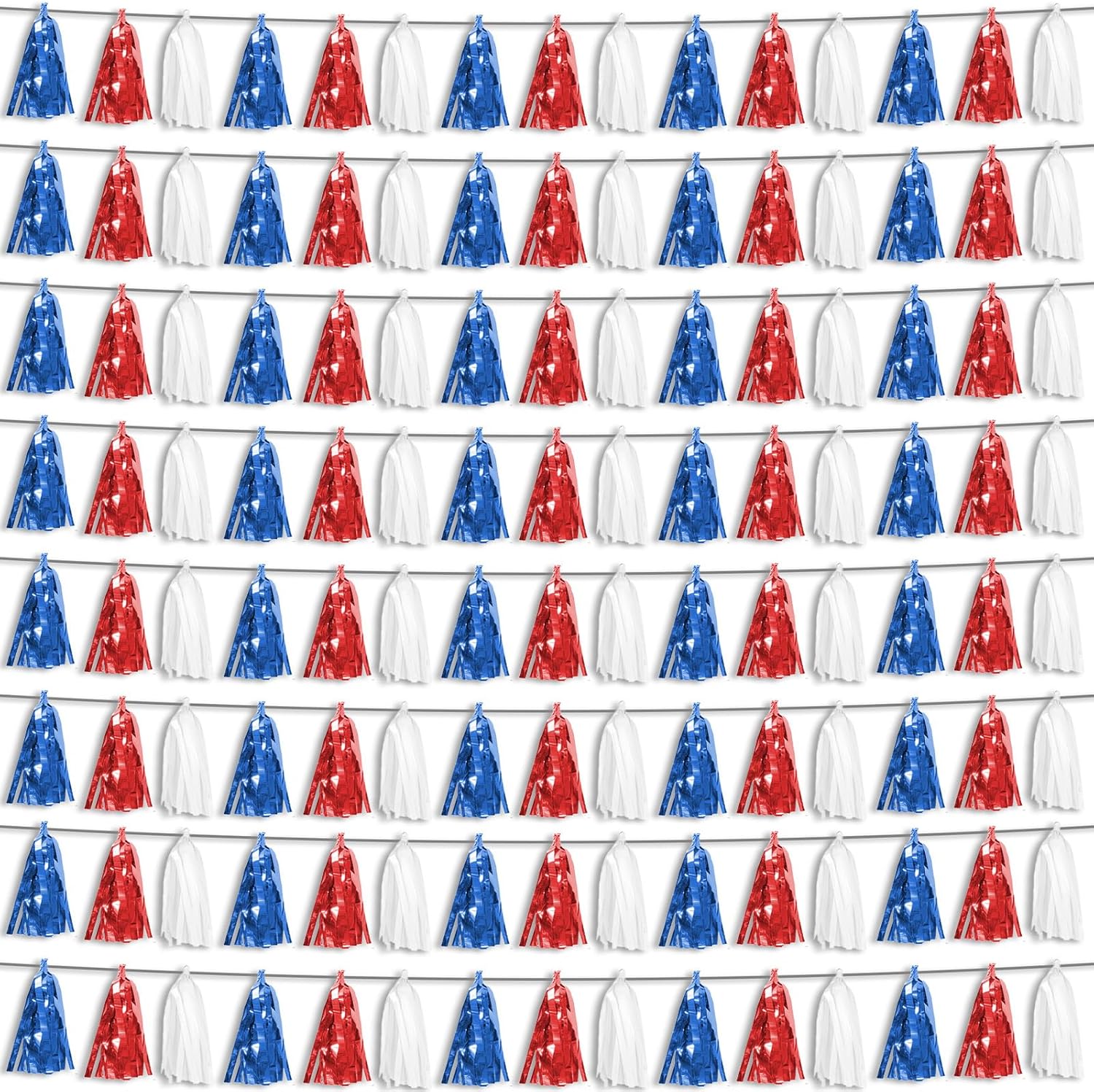- 【Red Blue White Party Supplies Set】: The total length of the Red Bule White birthday tassels banner is 78.7 feet 120tassels, divided into 8 strips, each 9.8 feet long. Each banner contains 15 tassels, and each tassel measures 14 inches, for birthday decorations many occasions, and so on