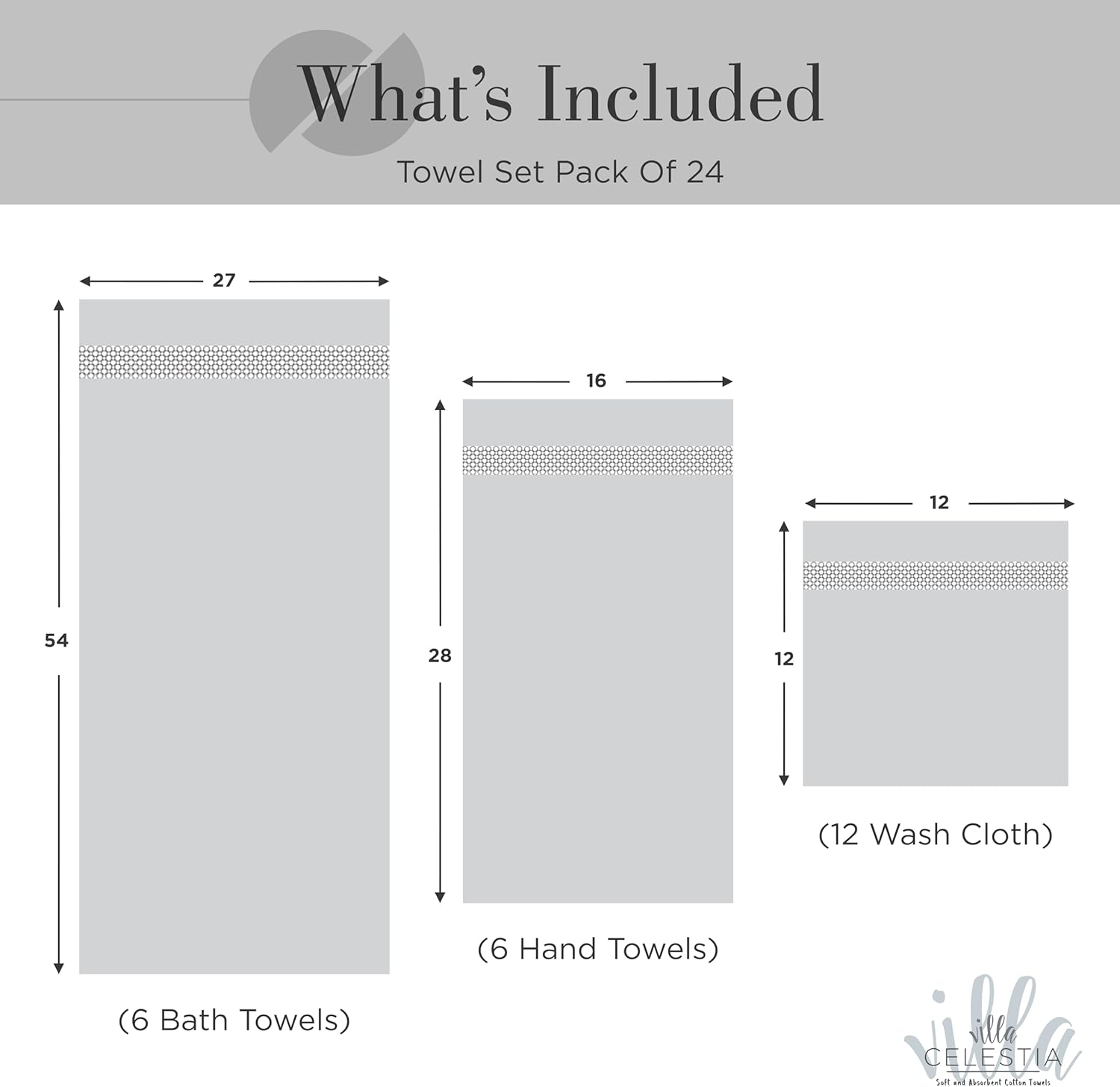 - VILLA CELESTIA LUXURIOUS TOWEL SET (PACK OF 24): Uplift your mood and bathing experience with the super soft and luxurious touch of our Villa Celestia Bath Towels Set. Bundled in a 24 pack design, our towel sets for bathroom consists of 6 Bath Towels (27” X 54”), 6 Hand Towels (16” X 28”), and 12 Washcloths (12” X 12”), giving you the complete package of comfort, indulgence, and delight.