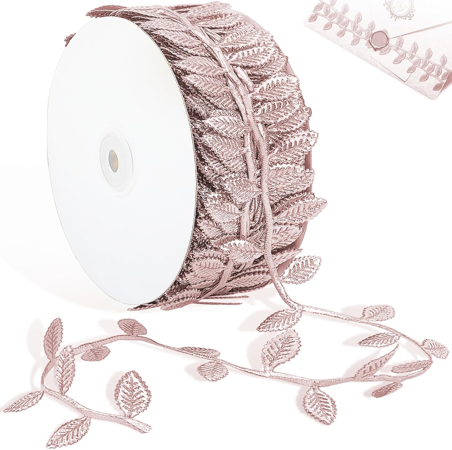 - [Widely Decor Application]: The rose gold leaf ribbon is perfect for gift wrapping, DIY crafts, wedding invite decor, wedding cake, scrapbooking, headband making, sewing on the clothes or sash, wreath embellishing, garland adorning, etc. Adding vibrant color, elegance and charm for your projects. You can't miss it!
