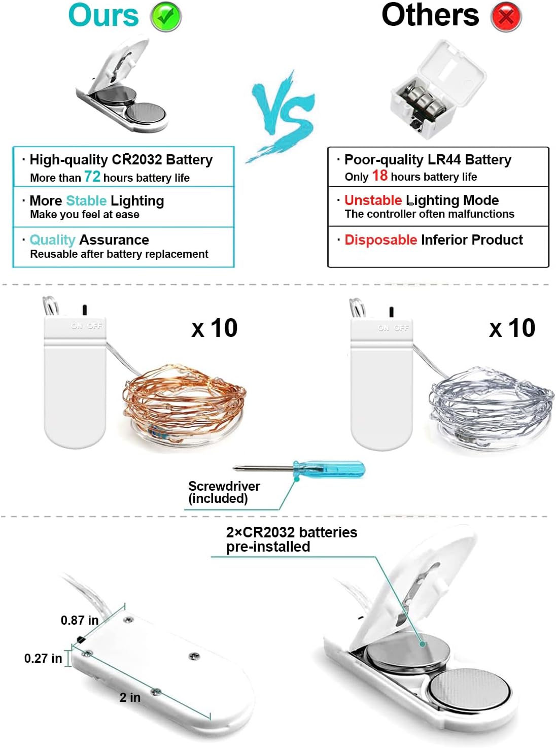 - Wide and Diverse Applicated Scenarios: Our LED fairy lights by battery operated can be used indoor and outdoor since the string lights are waterproof (Note: the battery case is not waterproof). The portable mini lights can be taken to anywhere you want to decorate. Moreover, our battery case is extremely mini in size(2*0.87 in), which makes it super easy to hide anywhere.
