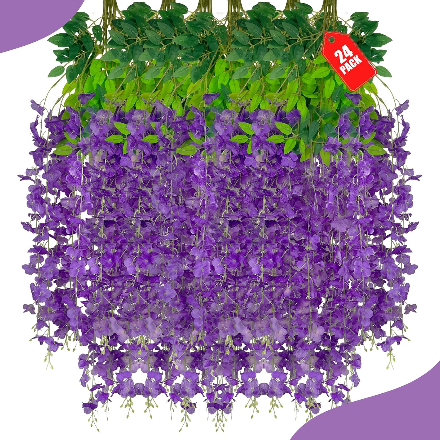 24Pack Purple Wisteria Hanging Flowers, 3.44 Ft Fake Hanging Flowers, Artificial Wisteria Garland Vines for Wedding Room Backdrop Outdoor Patio Garden Decoration
