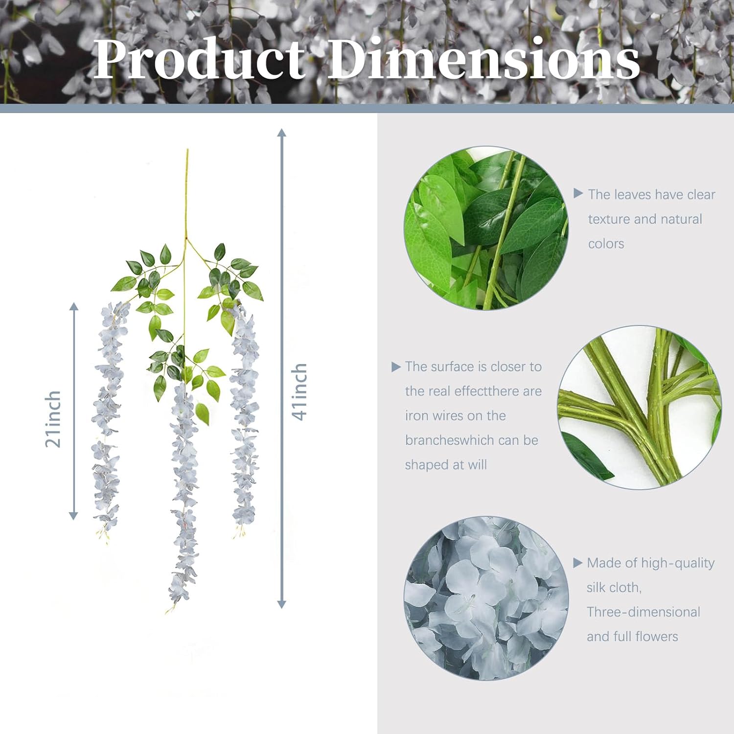 - 【Cycle Used】The grey artificial wisteria garland is made of silk, the stem is made of metal wire and plastic, and it can be easily bent and recovered, so you can use it many times, very environmentally and cost-effective.