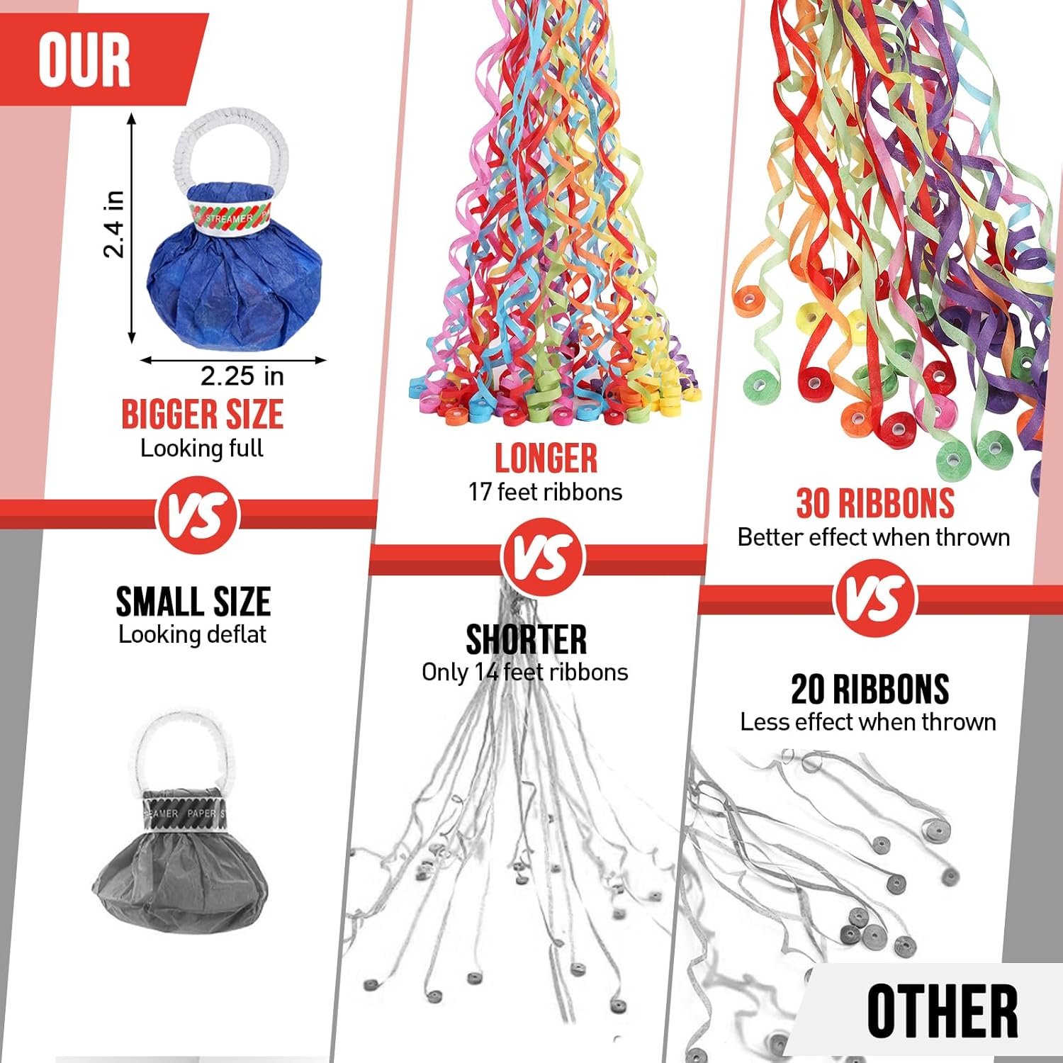 - 36Packs/30ribbons/17FT: Contains 36 packs of without each party poppers ribbons, a total of 30 ribbons, the length can be up to 17 feet. You can invite your guests to throw ribbons together! Add a surprise to your party.