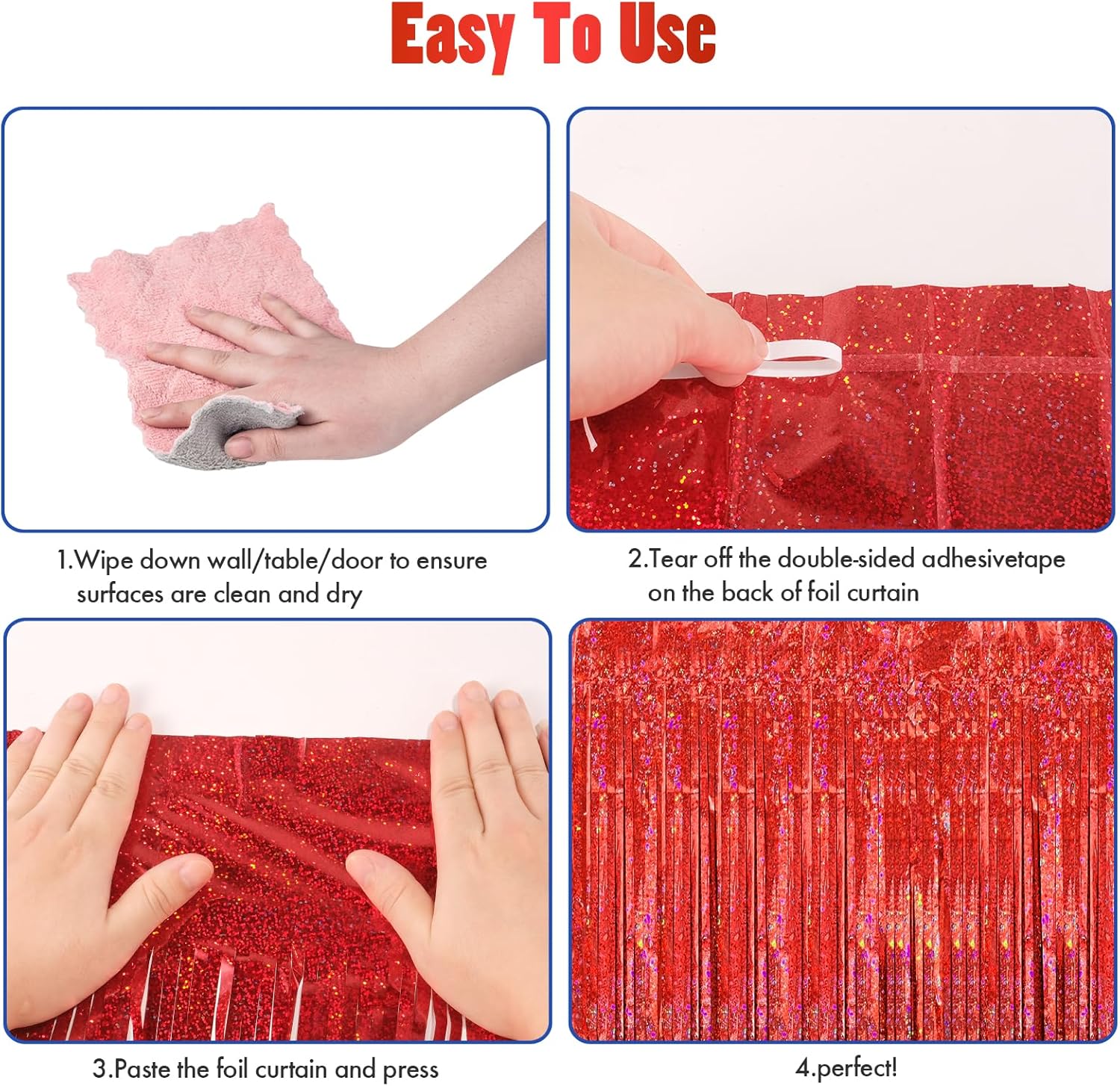 - 🎉SAFE & SHINY MATERIAL- This Glitter red tinsel backdrop is made of high-quality shiny tinsel, non-toxic, odorless, and non-fading, safe for families with children and pets. Just transform your home into a shining streamers happy birthday decorations, and enjoy the party.