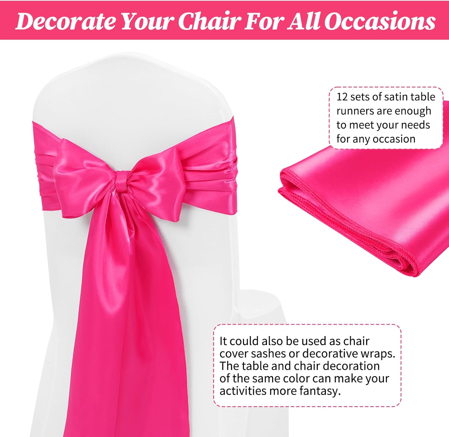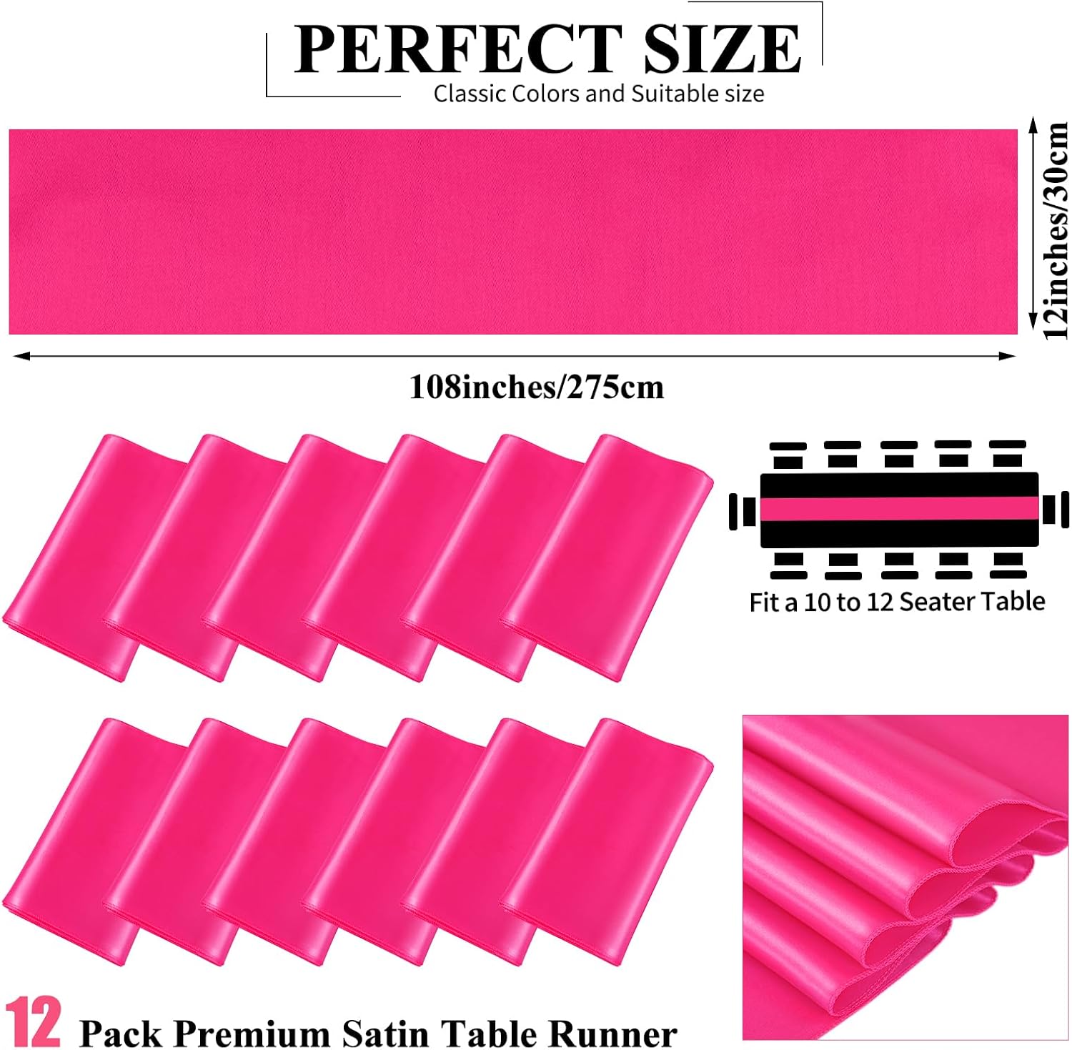 - đ·ăSet includesă12 Pack hot pink satin table runner measures 12" x 108" in size, appropriate for a table that can seat 8-10 people. This satin table runner can fit a 6ft/8ft rectangular table or round table well.This satin table runner is great for event table decorations.Our satin table runner make your dining table more dazzling and outstanding. Purchase ur 12piece satin table runner and save even more.