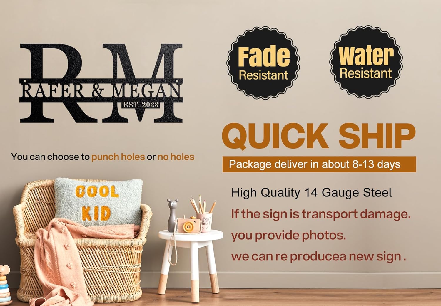 - HIGH-QUALITY CRAFTSMANSHIP: Our Personalized Last Name sign is Cut from heavy-duty grade 14 steel (0.08 inches thick). Heavy duty grade 14 steel will not be as thin as grade 16 and grade 18 steel, with a smooth surface and durability,These name signs will not flex nor break like products made of inferior materials.Your personalized metal sign used powder coated to give a smooth finish and long term durability