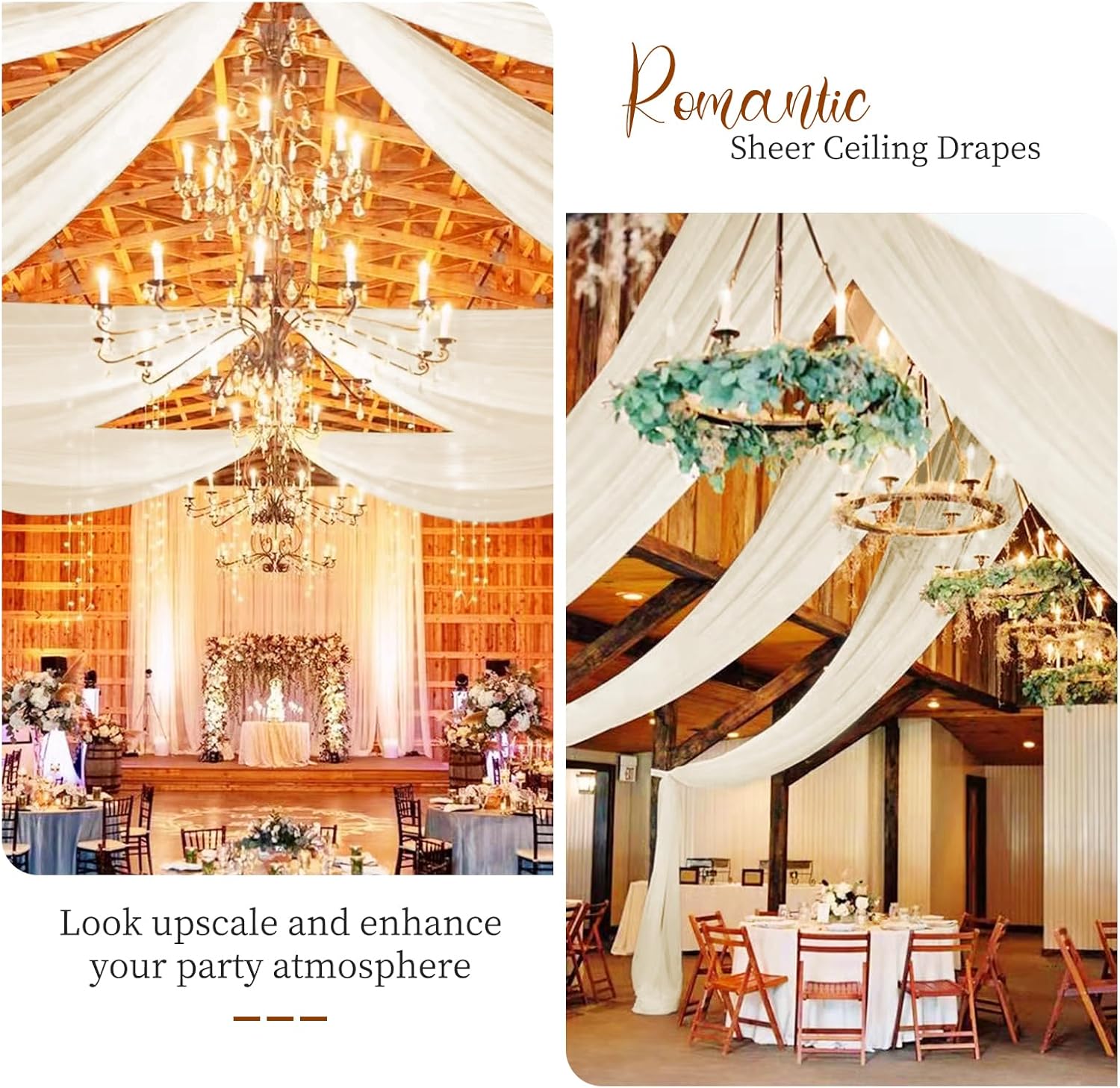 - 🍸Romantic Sheer Arch Drapes: The wedding ceiling curtains are finished with firm and exquisite stitching in all margins, which are airy and lightweight; here is a 4 inches pocket for rod or pole entry at the top and bottom of each panel creating beautiful draping. This sheer ceiling is also called as wedding decorations for ceiling, chiffon draping, tent draping fabric for wedding, event draping fabric, wedding wall covering, ivory stage curtains, etc.