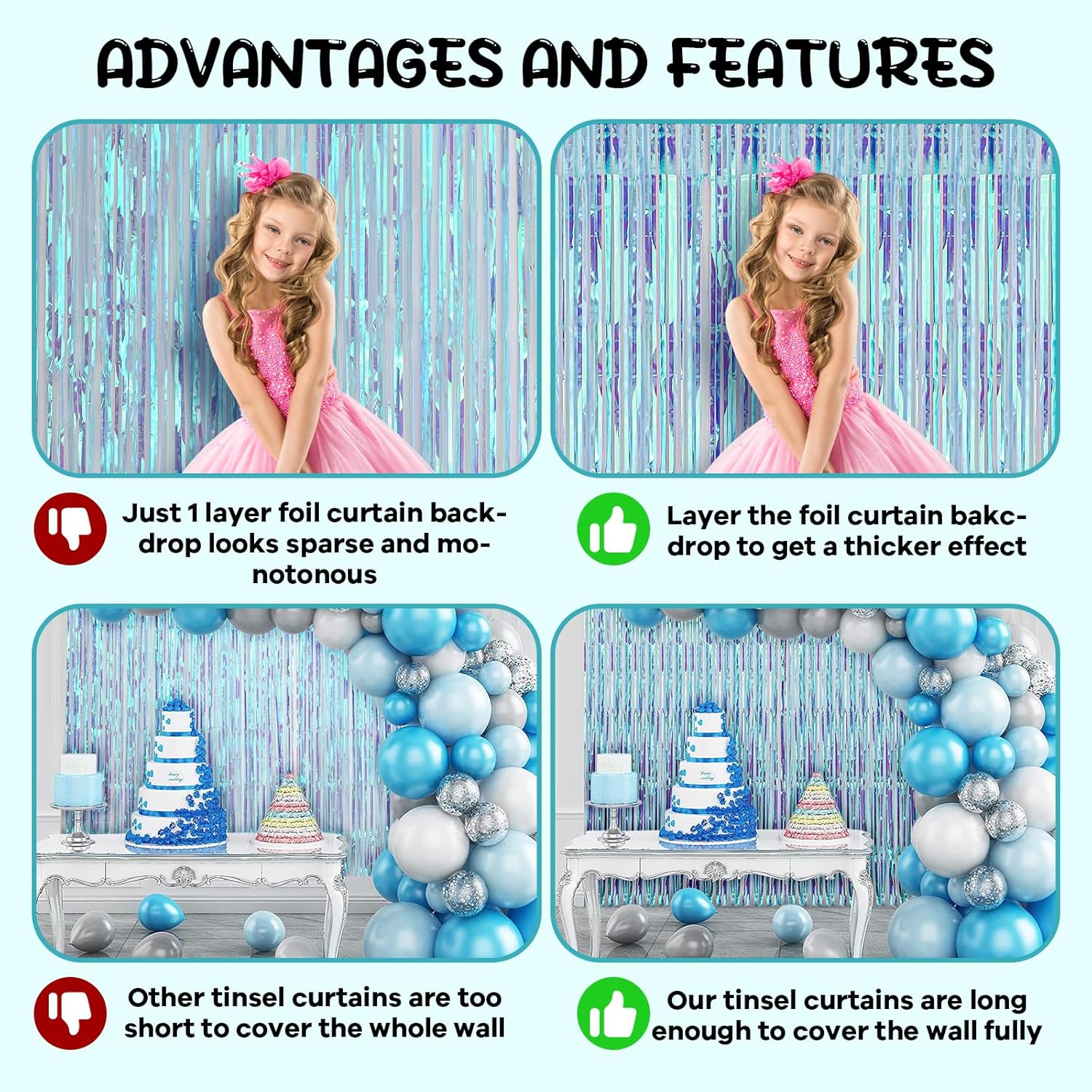- Eye-Catching Design: These tinsel backdrops boast vibrant colors and a shimmering effect that reflects light beautifully. Your friends will be mesmerized by the captivating atmosphere these curtains create