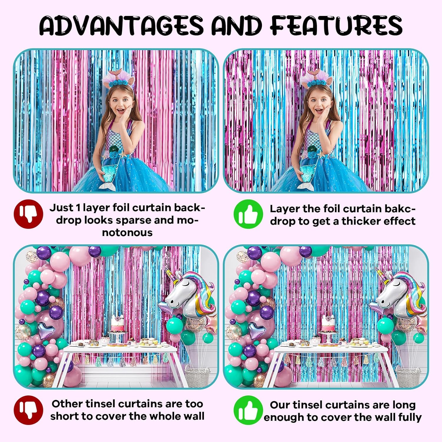 - Premium Material: This Blue and Pink foil curtain backdrop is made of stable tinsel, non-fading, stay shiny and reusable. Unfold it and then enjoy your glittering party