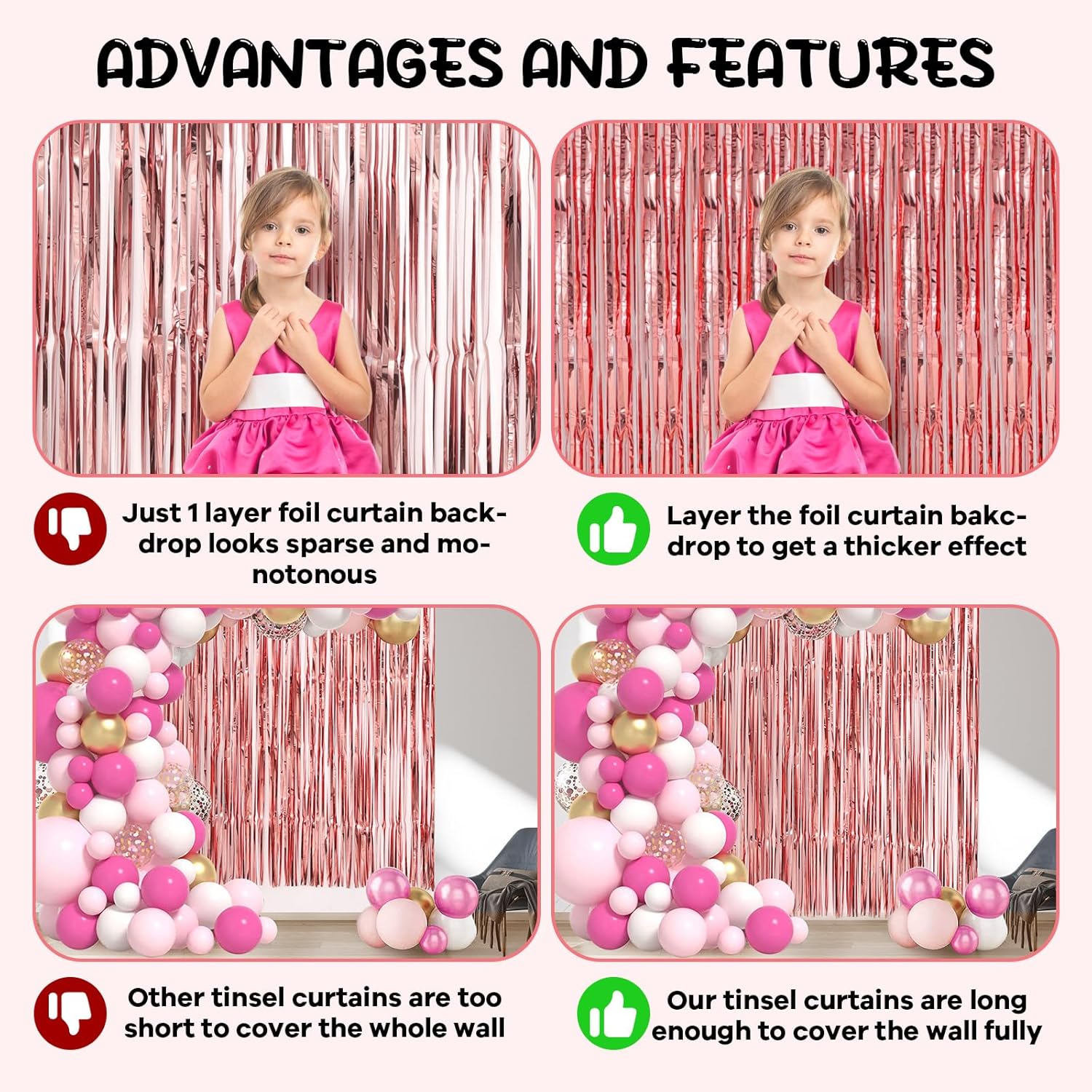 - Premium Material: This rose gold foil curtain backdrop is made of stable tinsel, non-fading, stay shiny and reusable. Unfold it and then enjoy your glittering party
