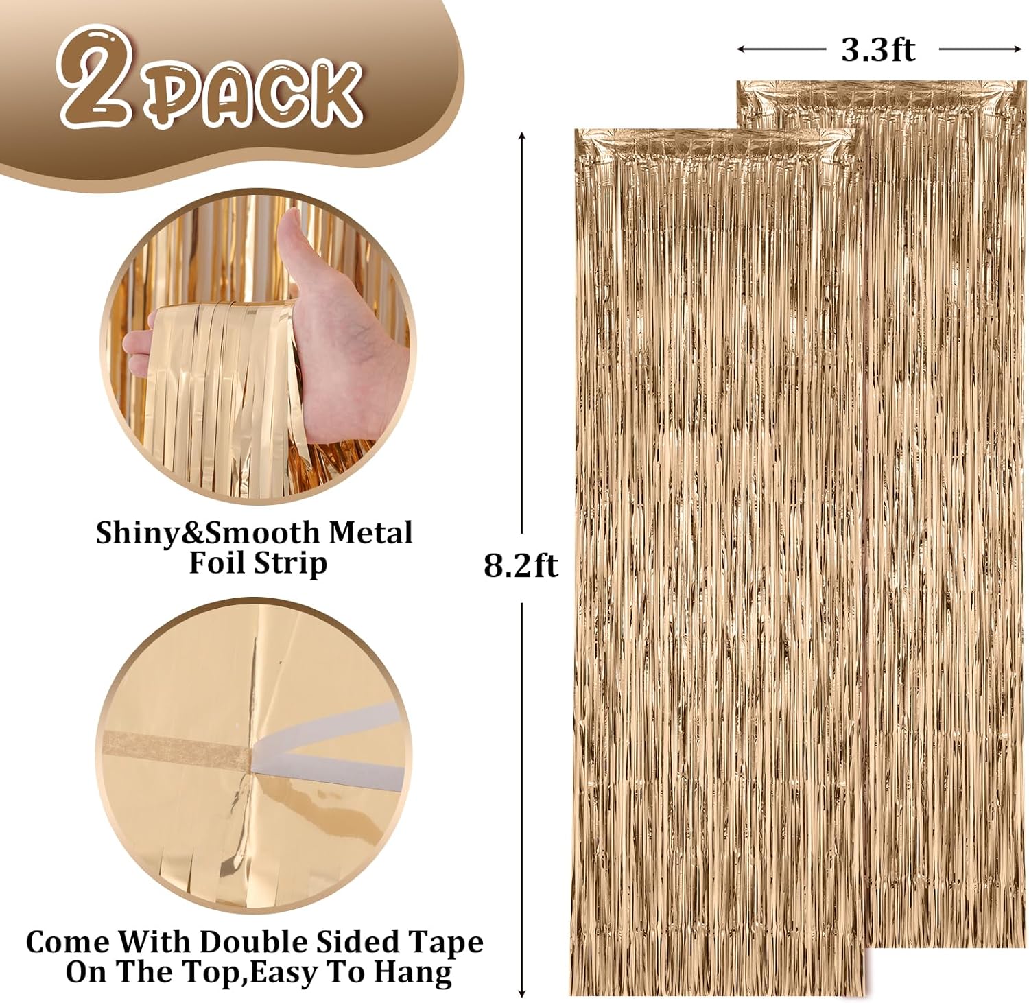 2 Pack Champagne Foil Fringe Backdrop Curtains, Tinsel Streamers Birthday Party Decorations, Fringe Backdrop for Graduation, Baby Shower, Gender Reveal, Disco Party