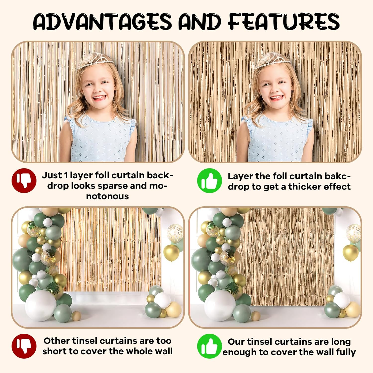 - Premium Material: This champagne foil curtain backdrop is made of stable tinsel, non-fading, stay shiny and reusable. Unfold it and then enjoy your glittering party