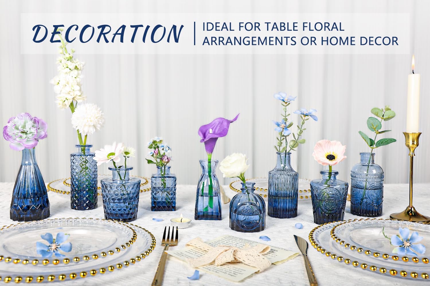 - ELEGANT VINTAGE STYLE: This set includes 12 blue glass bud vases, each adorned with delicate etched patterns for added charm. These flower vases boast a classy vintage design, suitable for any occasion, from casual to formal. Spruce up your window sill, dining table, or wedding reception with these beautiful vintage décor vases, creating an elegant centerpiece that will captivate all who see them.