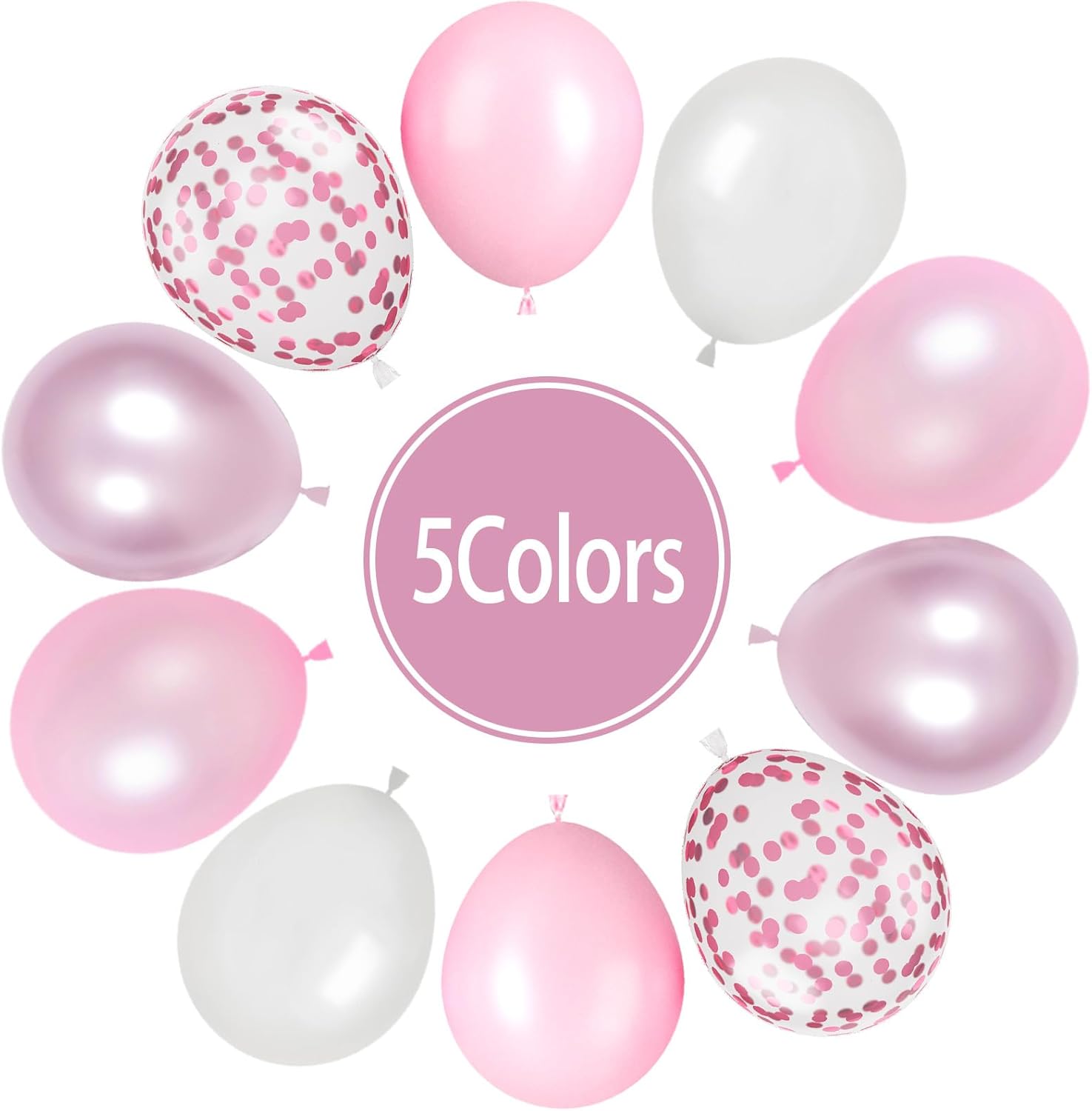- Pink Balloons Set: The 12 inch 62pcs pink balloons set includes different shades of pink balloons: 14pcs macaron pink balloons, 14pcs pearl pink balloons, 10pcs metallic pink balloons, 10pcs pink confetti balloons, 12pcs pearl white balloons, 2 rolls of ribbon. A variety of pink latex balloons is suitable for your beautiful art theme decoration.
