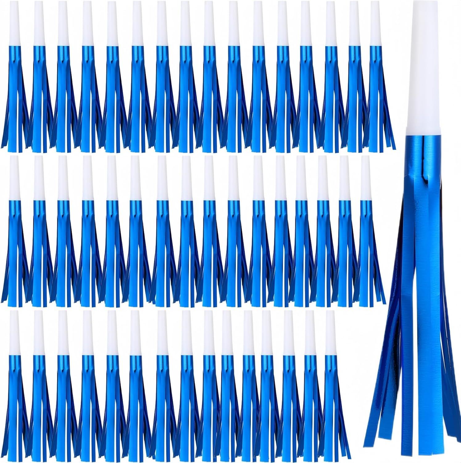 48 Pcs Noise Makers Glitter Metallic Fringed Noise Makers Horns for Baby Shower, Kids Birthday, New Year Party Favor - White Blue