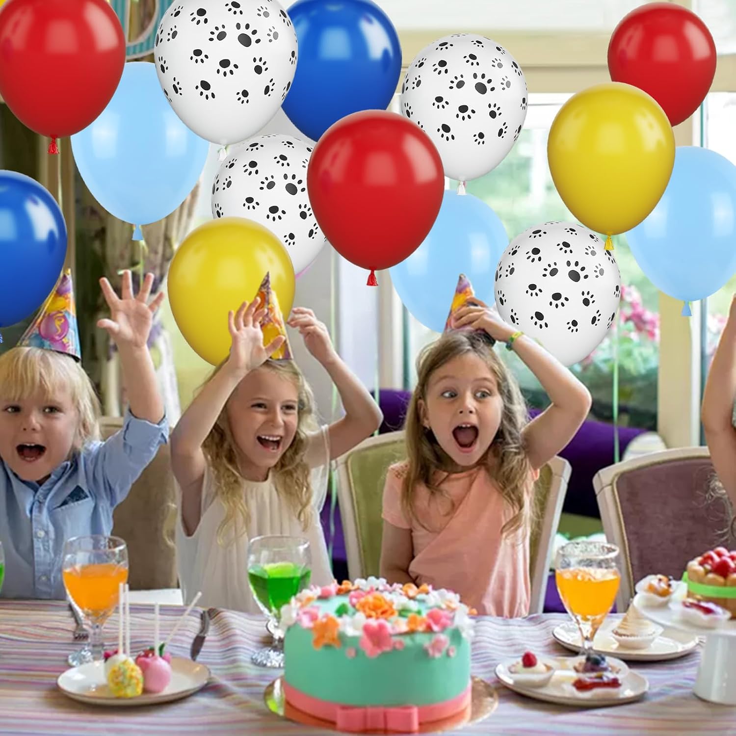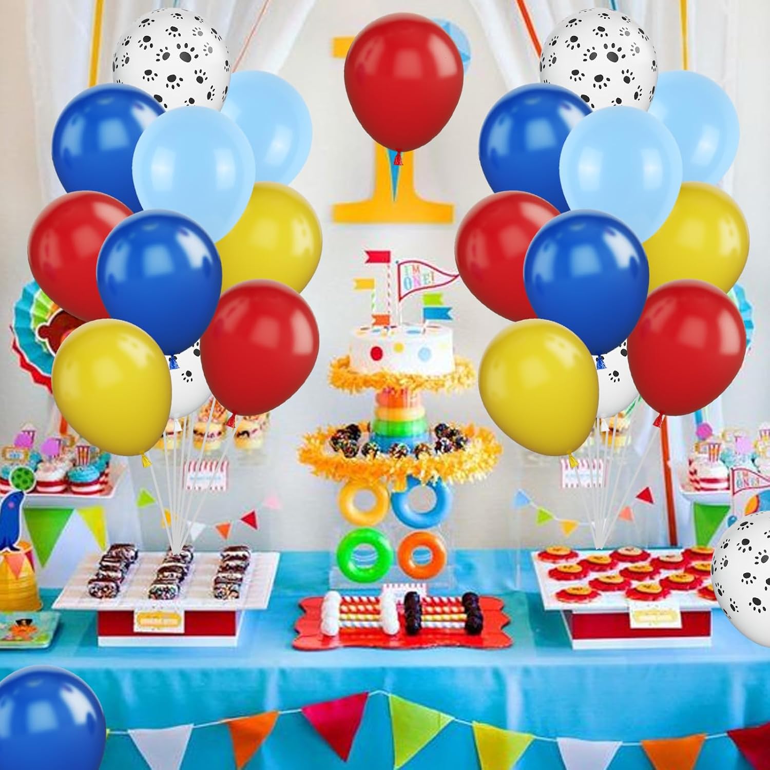 - 12 Inch dog paw balloons: Package content includes 6 pcs royal blue balloons, 6 pcs yellow balloons, 6 pcs red balloons,6 pcs pastel blue balloons,6 pcs paw balloons, a balloon ribbon.