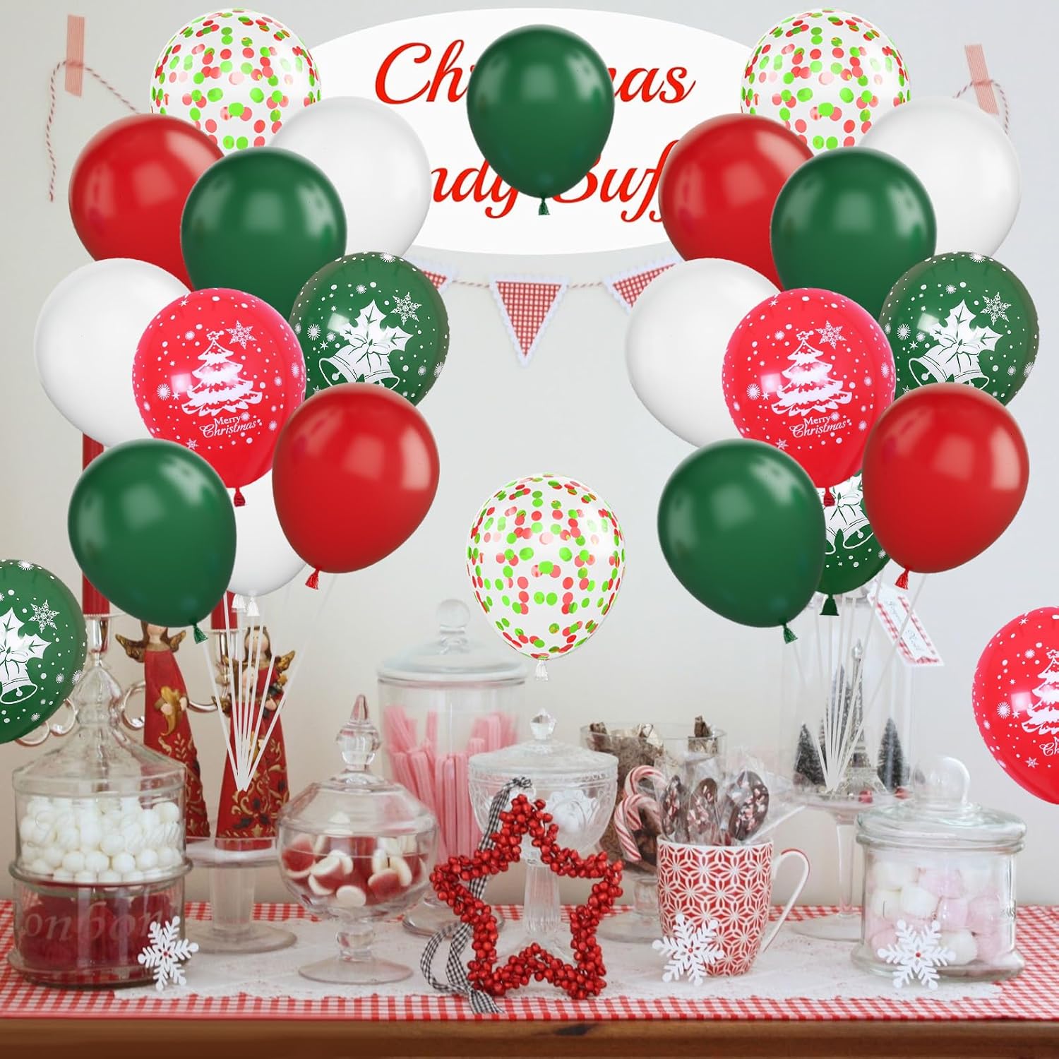 - 12 Inch christmax balloon set: Package content includes 12 pcs green balloons, 6 pcs confetti rose gold Balloons, 12 pcs red balloons, 10 pcs white balloons,5 pcs christmax tree printed balloons,5 pcs deer printed balloons, a balloon ribbon