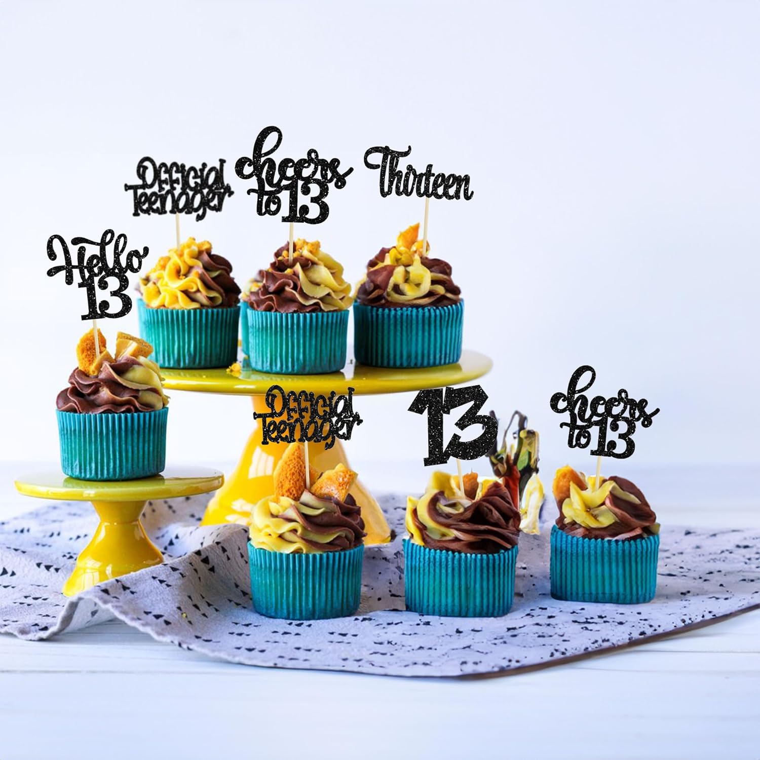 30Pcs 13th Birthday Cupcake Toppers Hello 13 Cupcake Picks Official Teenager Cheers to 13 Years Old Cake Decorations for 13th Birthday Anniversary Party Supplies Black Glitter