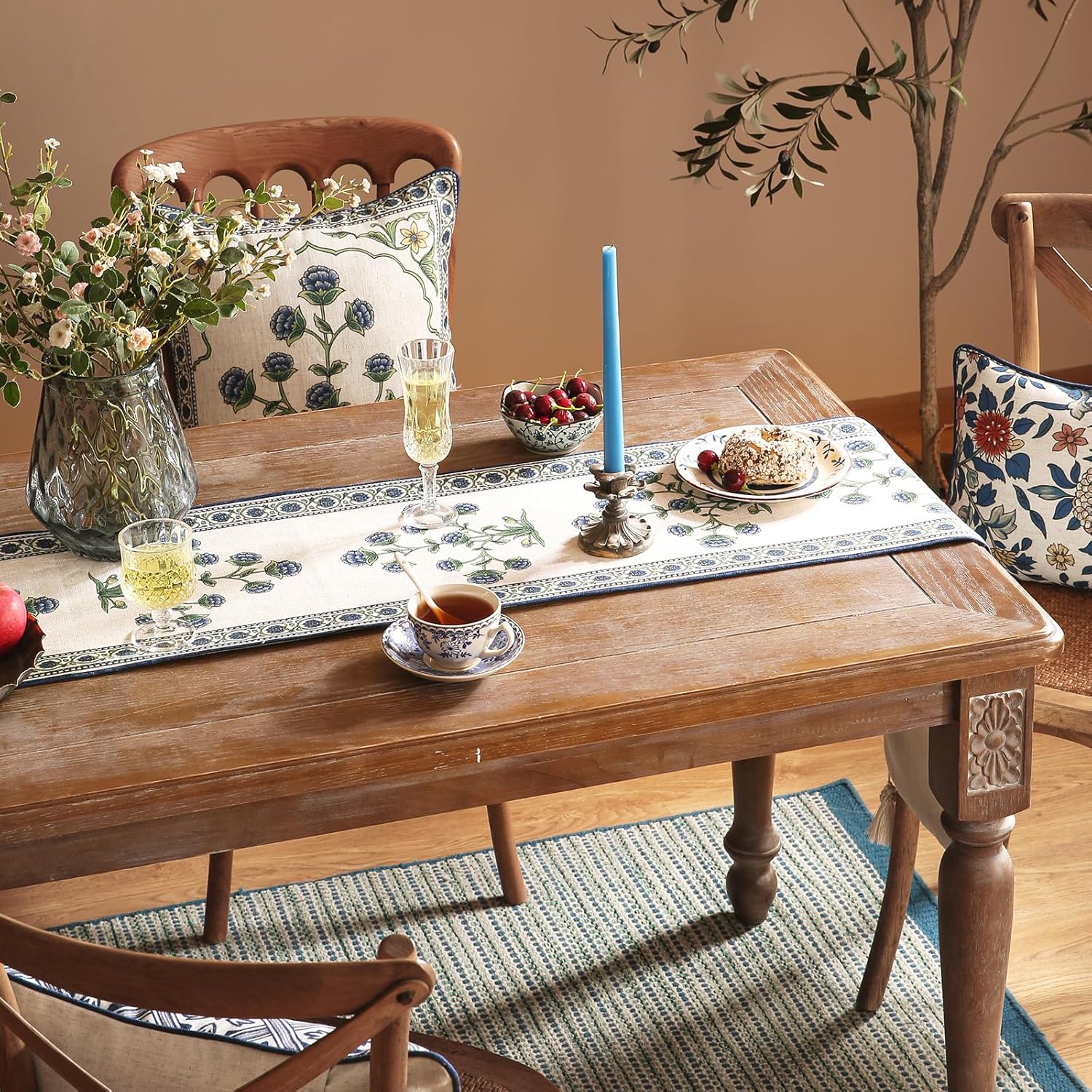 patdrea Designer Blue Rustic Elegant Floral Patterned Linen Table Runner 87 Inch Long,Wrinkle Resistant Table Mat,Decoration for Kitchen Dining and Coffee Tables Banquet Christmas , 12"x87"