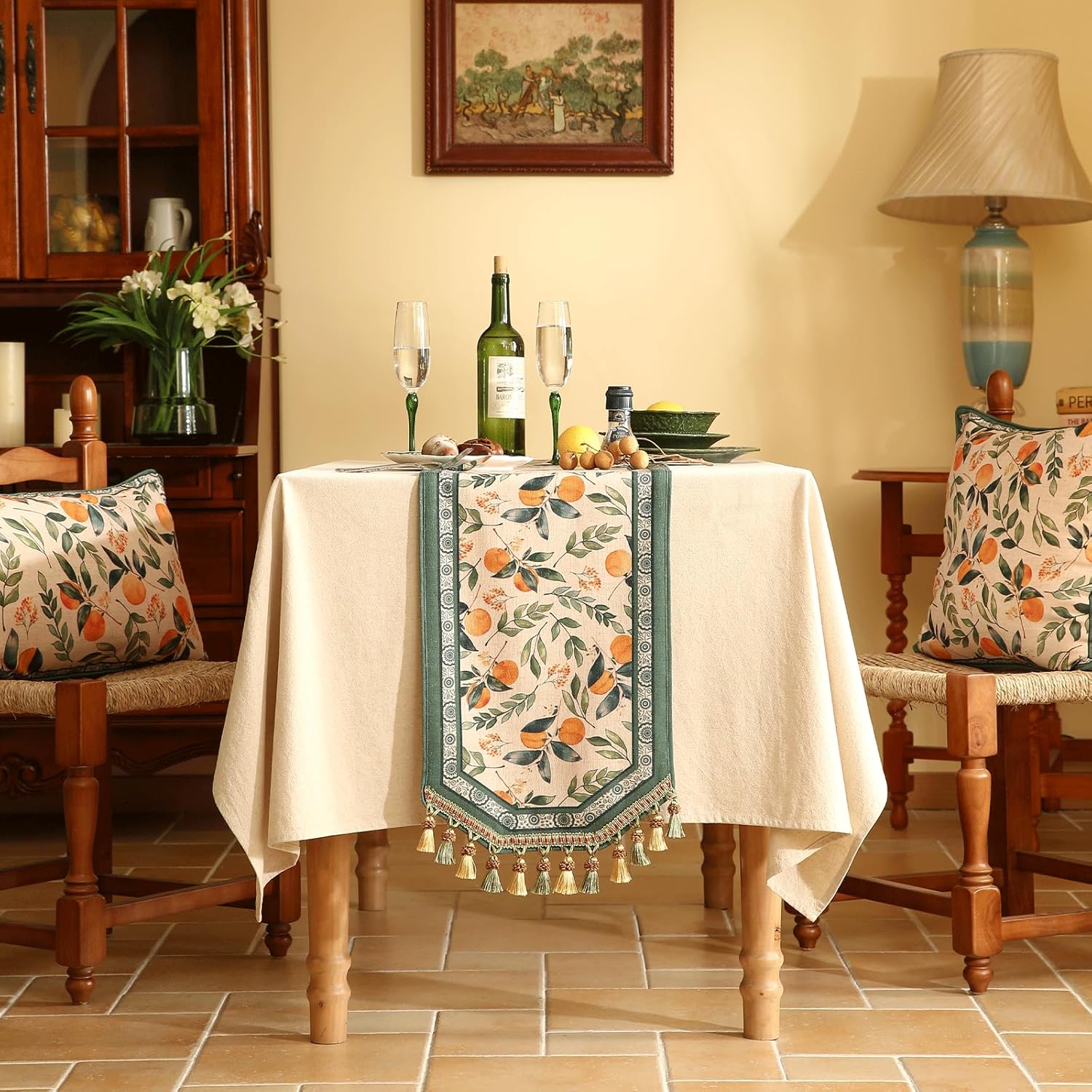 patdrea Designer Vintage Fresh Farmhouse Extra Long Linen Table Runner 118 Inch Long, Green and Orange Pattern Table Mat, Decor for Kitchen Dining Table Coffee Table Cabinet Christmas,16"*118"