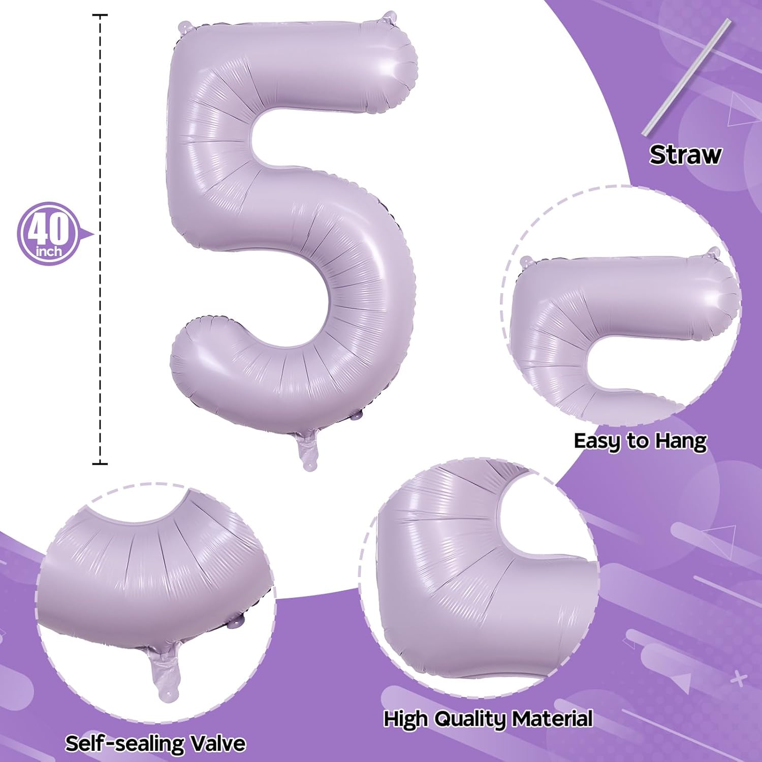 - š Pastel Purple Number 50 Balloon Set š - You will get 2pcs 40 inch light purple mylar foil number balloons (number 5 + number 0) and 1pc straw. Perfect for decorating girls women 5th or 50th birthday party.