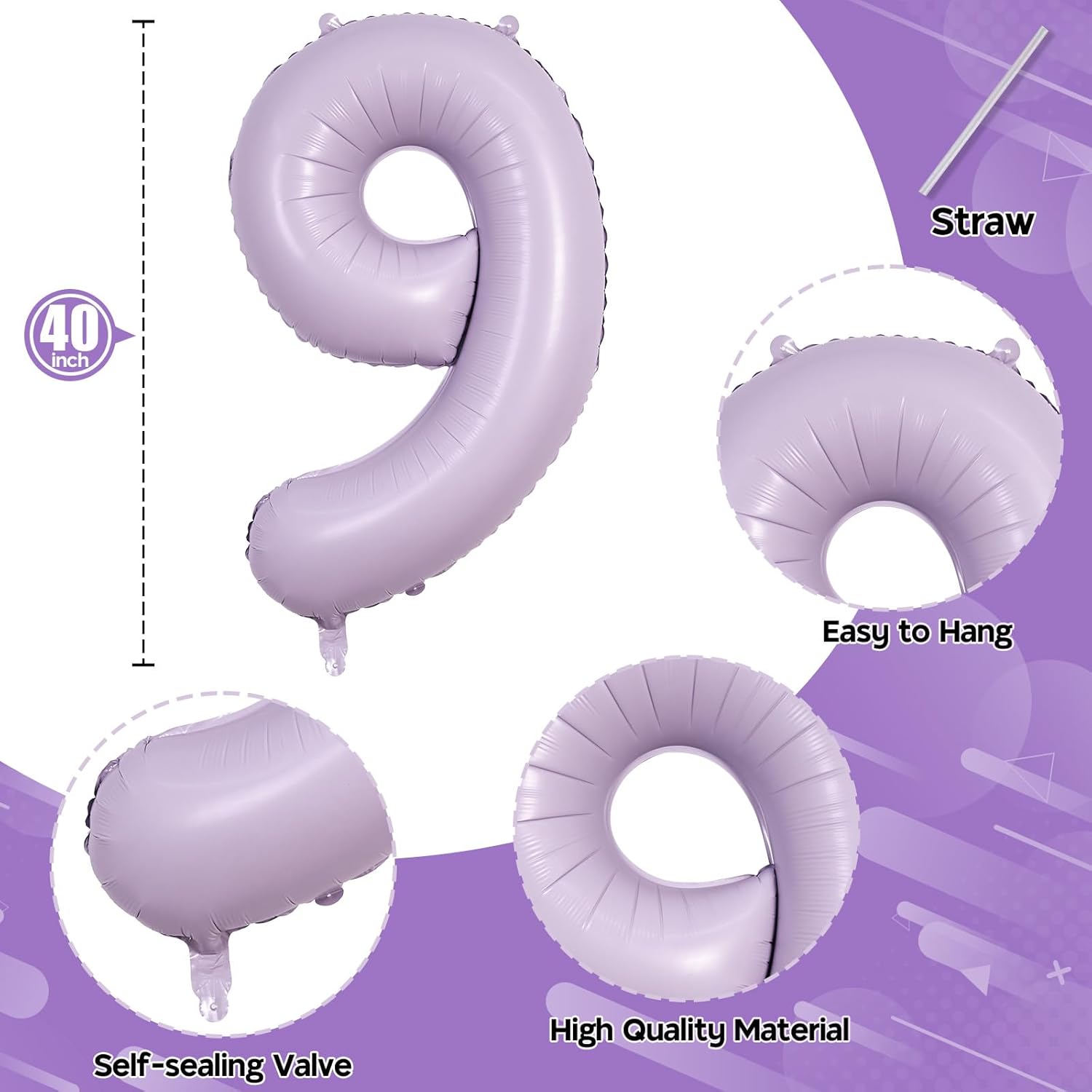 - š Pastel Purple Number 9 Balloon š - You will get 1pc 40 inch light purple mylar foil number 9 balloon and 1pc straw. Perfect for 9th 19th 29th 90th birthday or anniversary party decorations supplies.