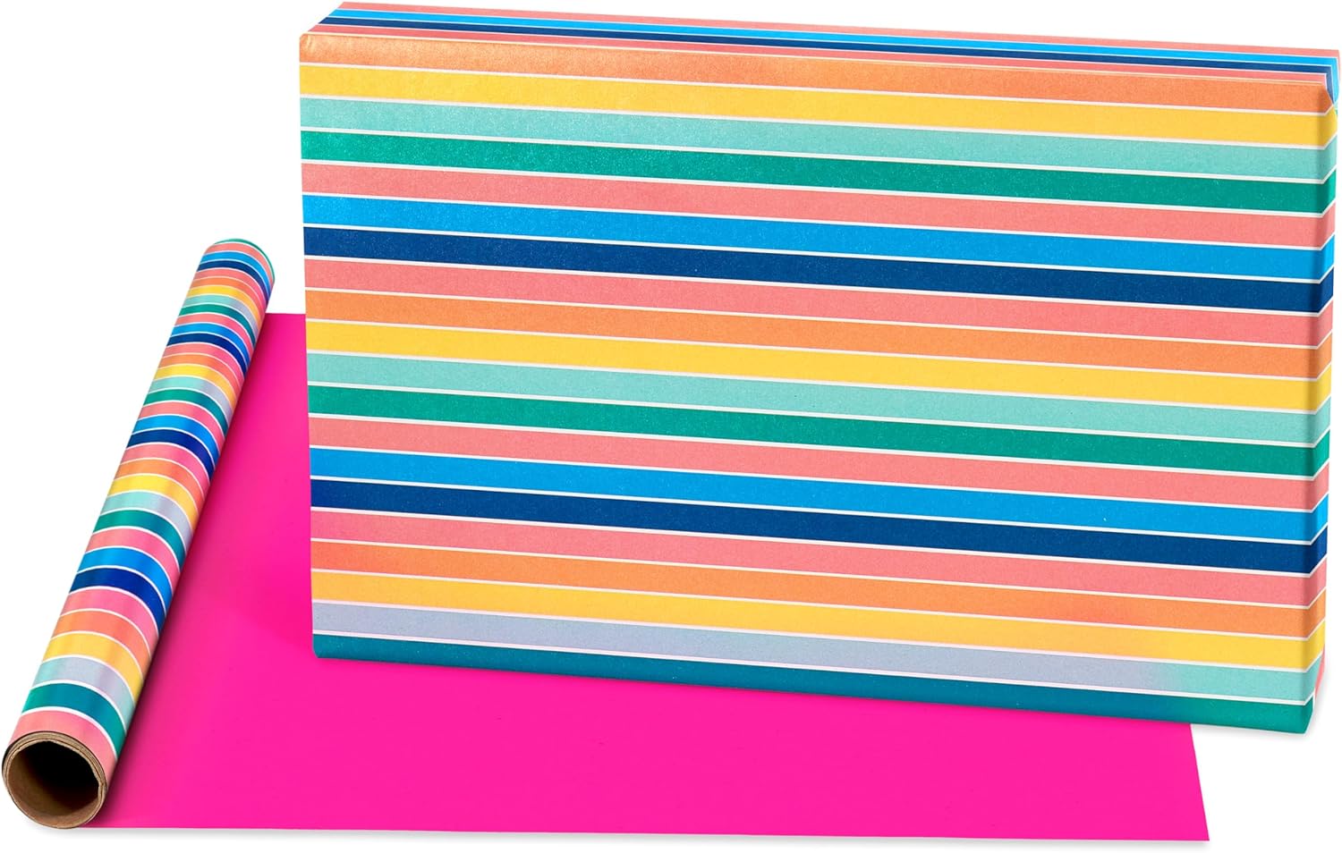 - This reversible multi-roll wrapping paper set features a bright assortment of colors including a gradient blue, solid bright pink and blue, and fun patterns of rainbow stripes, light blue diagonal stripes, mini rainbows, colorful polka dots, and bold lettering of the word, "Happy" printed on metallic foil for extra shine.