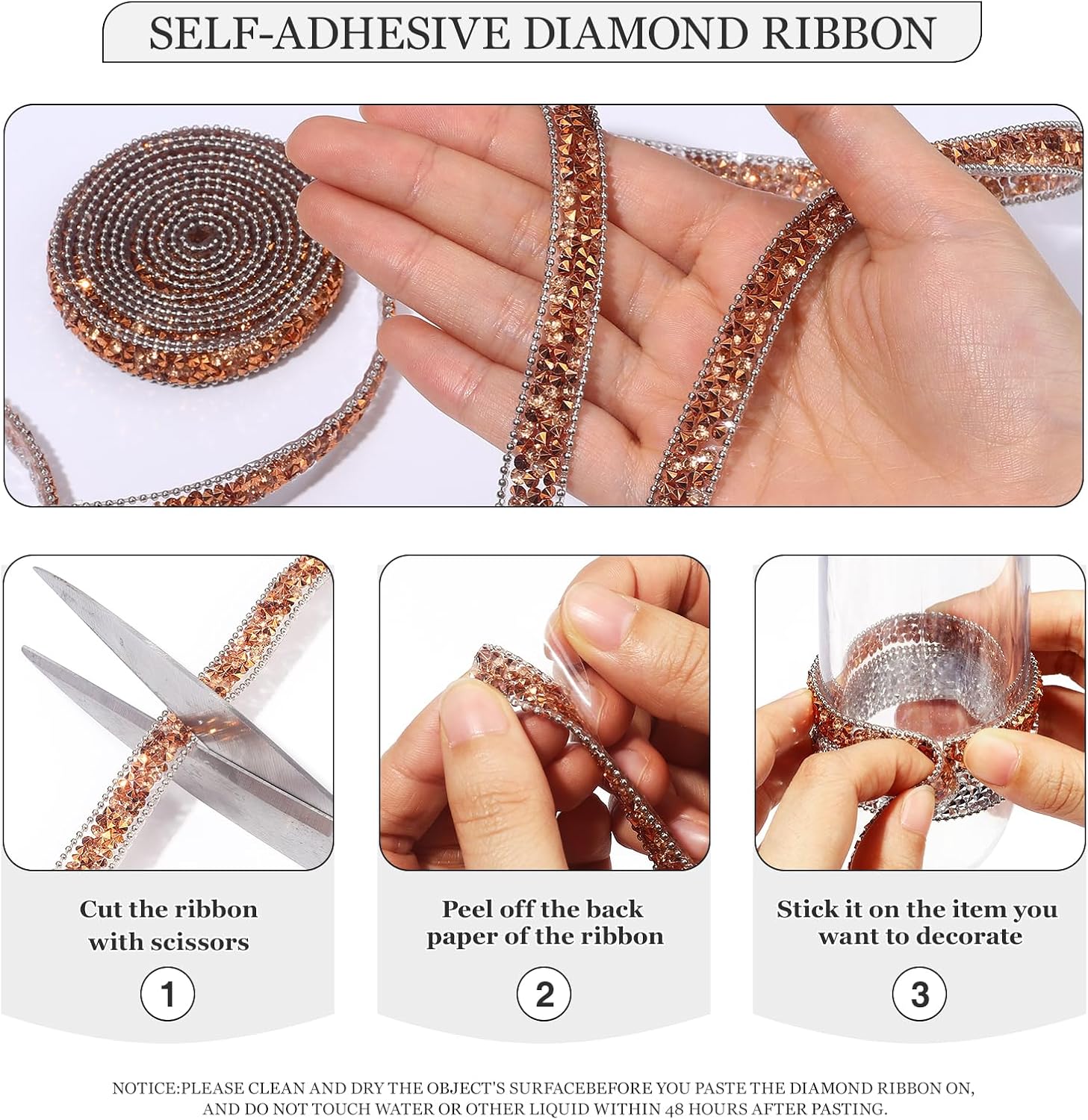 - Self-Adhesive Diamond Ribbon: The self-adhesive design with backing glue makes it possible to stick anywhere as long as the surface is smooth and clean. You cut the rhinestone ribbon into different lengths with scissors, then peel off the back paper of the sticker and paste it on the project you want to decorate.