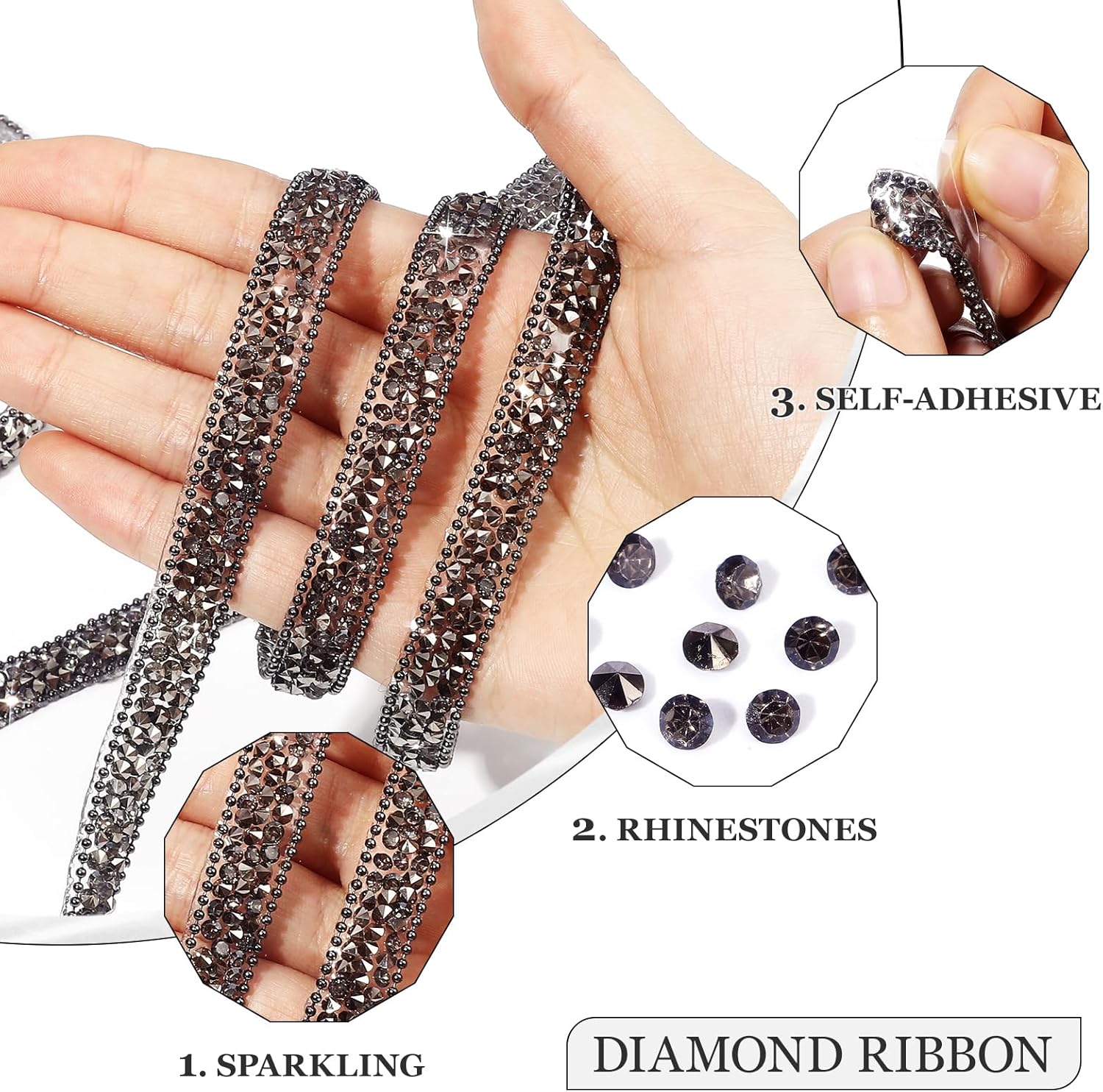 Rhinestone Ribbon 6 Yards Self Adhesive Rhinestone Strips Diamond Ribbon Sticker Crystal Roll Glitter Bling Rhinestones Tape for Crafting DIY Art Decoration (Jet Hematite,0.4 Inch)