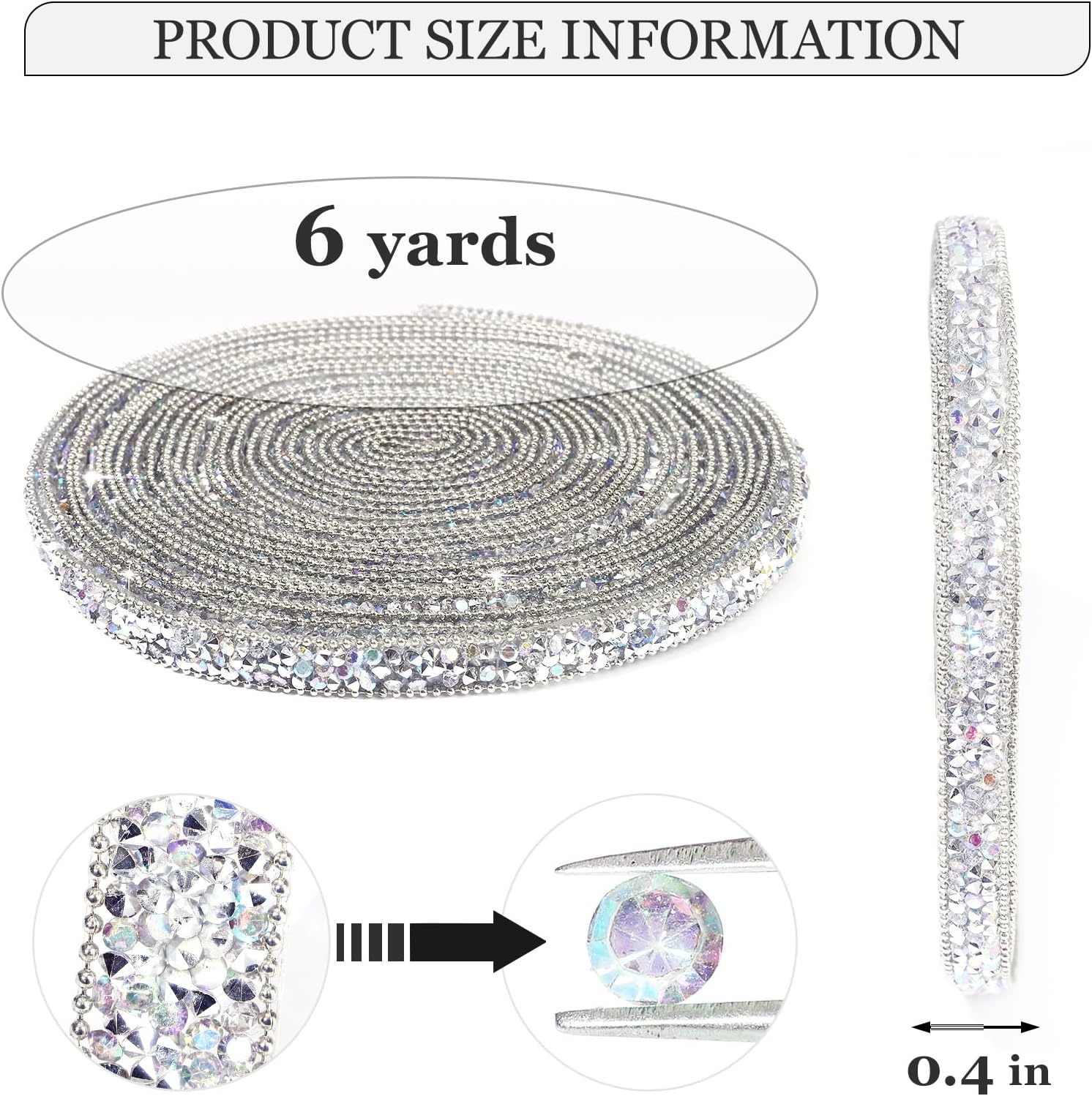 - SilverAB Rhinestone Ribbon: 1 roll of self-adhesive rhinestone ribbon Sticker, approx 6 yards in length, 1cm/0.4inch in width. (PACKAGE CONTENT)