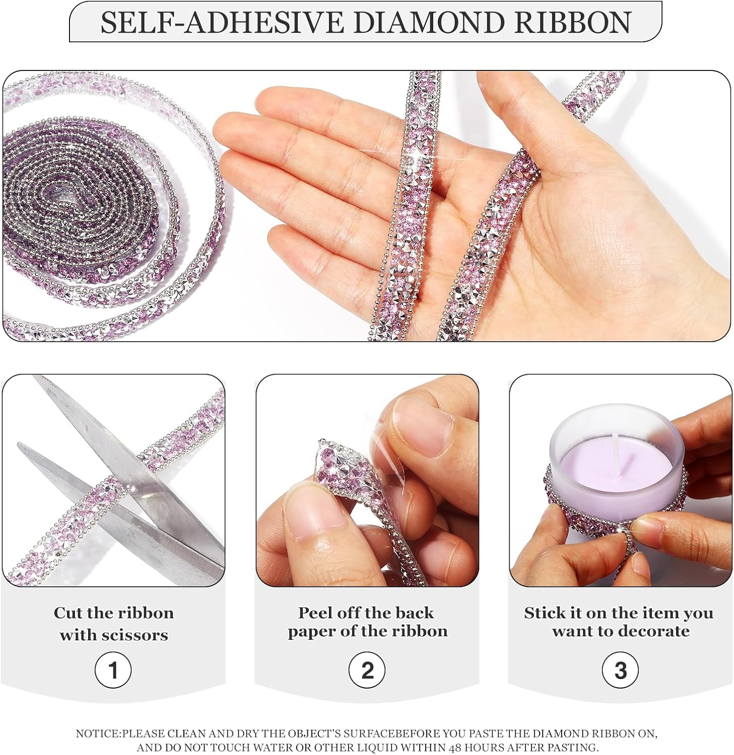 - NOTICE: 1. Please clean and dry the object's surface before you paste the diamond ribbon on, and do not touch water or other liquid within 48 hours after pasting,2. Please open this outside and air them out for a while! because the odor from production is trapped in shipping. Please give it time to let the smell go.