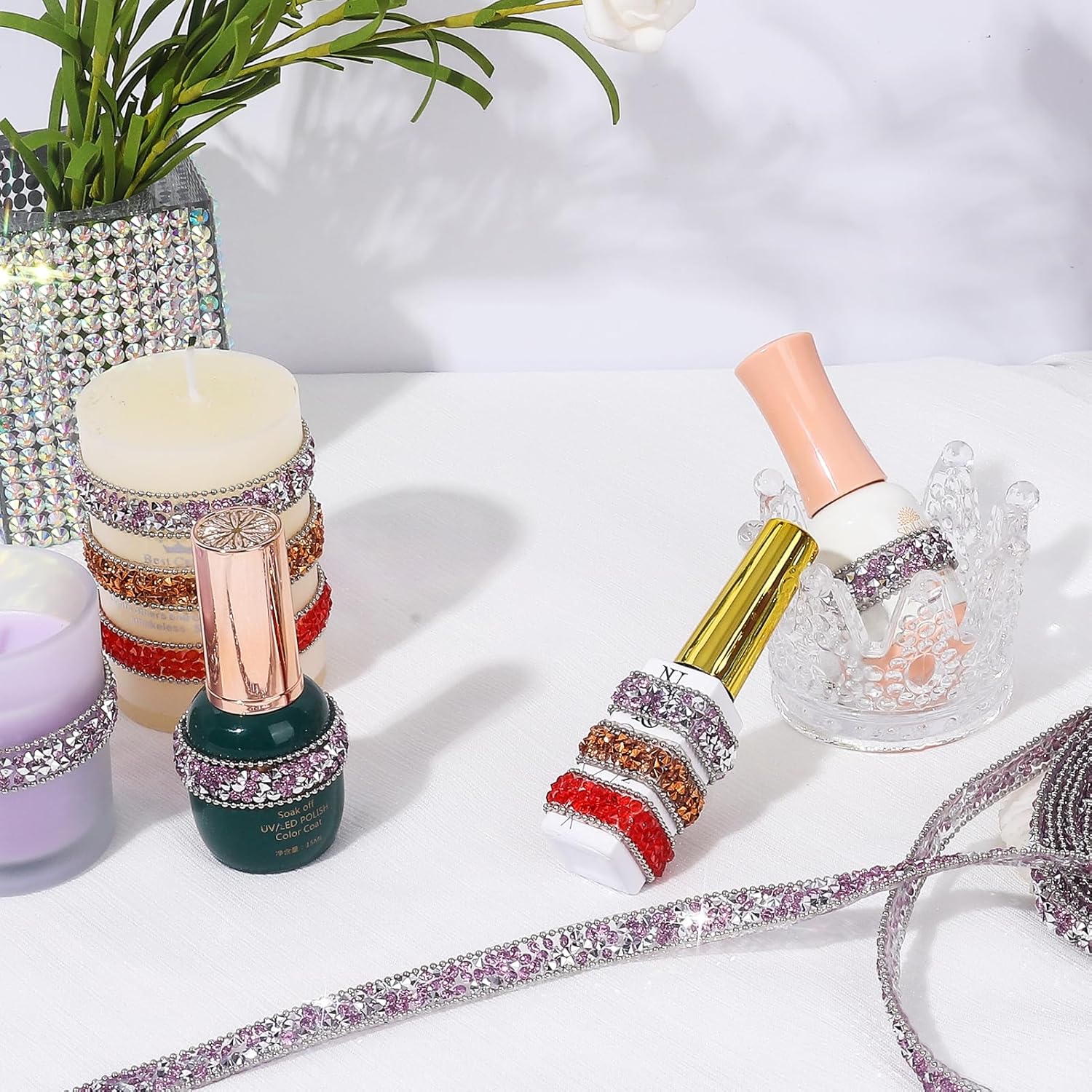 - Wide Applications: The bling rhinestone sticker strip is suitable for many DIY decorations, mirrors, candles, vases, photo frames, costumes, home decor, offices, gardens, cars, personalized phone cases, jewelry boxes, and other places.