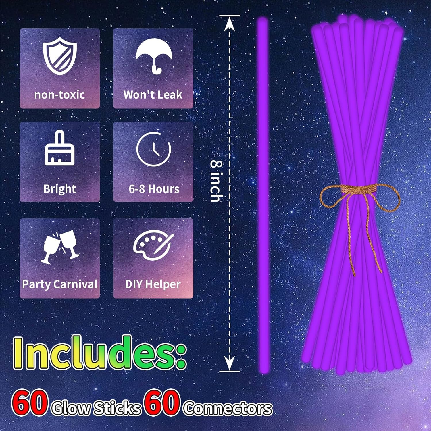 60 Pack 8” Purple Glow Sticks Bulk with 60 Connectors Neon Glow In The Dark Party favors Supplies for Holiday Birthday Party Decoration (Purple)