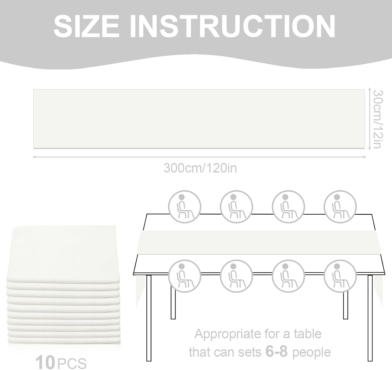 - PACKAGE CONTENTS:You will get 10 pieces of chiffon tablecloths, single tablecloth size: 30 x 300cm/12 x 120in. Each tablecloth is equipped with 2 white ribbons, which can be used to tie the sides to fix, the quantity is enough for wedding banquet and various parties, our tablecloths are suitable for tables with 6-8 seats
