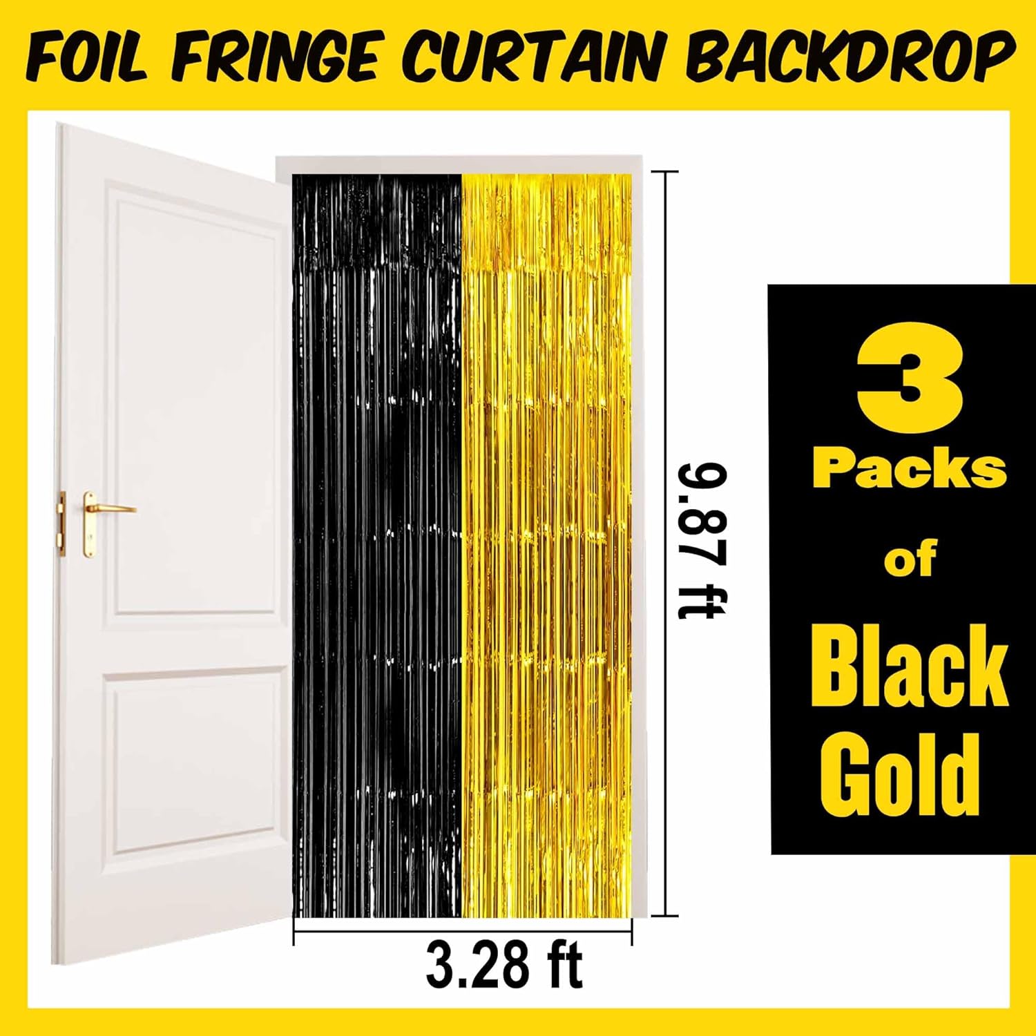 3 Pack Black and Gold Foil Fringe Curtains Backdrop, 3.28 x 9.8 Ft Metallic Streamers Tinsel Curtains Background for Photo Booth, Birthday, Halloween, Christmas, New Year Party Decorations