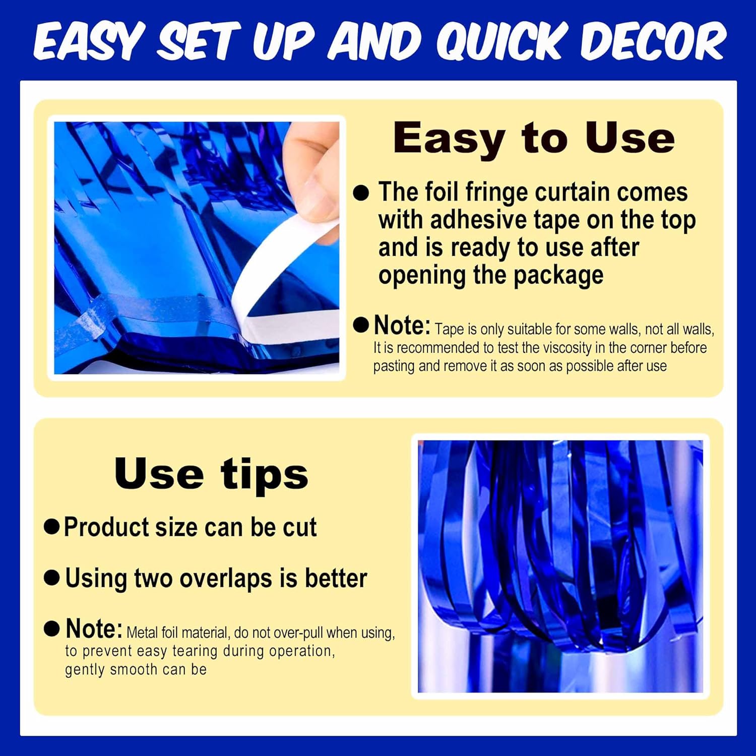 - Easy to Use: The tinsel foil fringe streamers curtain backdrop comes with double sided tape on the top, gently peel plastic strip off and it would be very easy to paste on smooth surfaces such as wall, window, table, door or anywhere you like