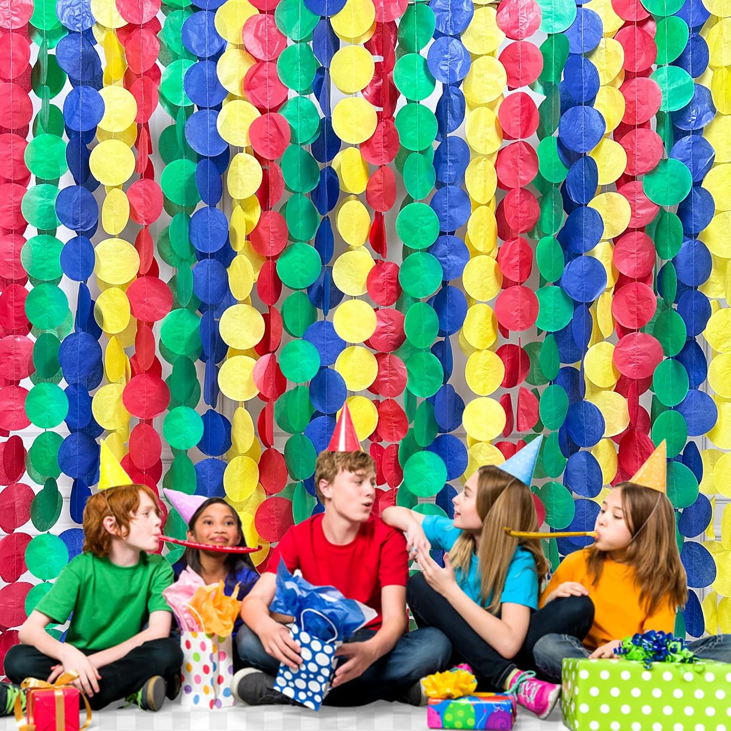 - 🟢ENVIRONMENTAL MATERIAL-Our red yellow green blue big circle dot streamer garland are made of high quality tissue paper,carefully hand-made and machine-sewn together with thread.durable and reusable.Unroll & unwrap the tissue paper garland carefully. Due to delicate nature of thread, may tangle.