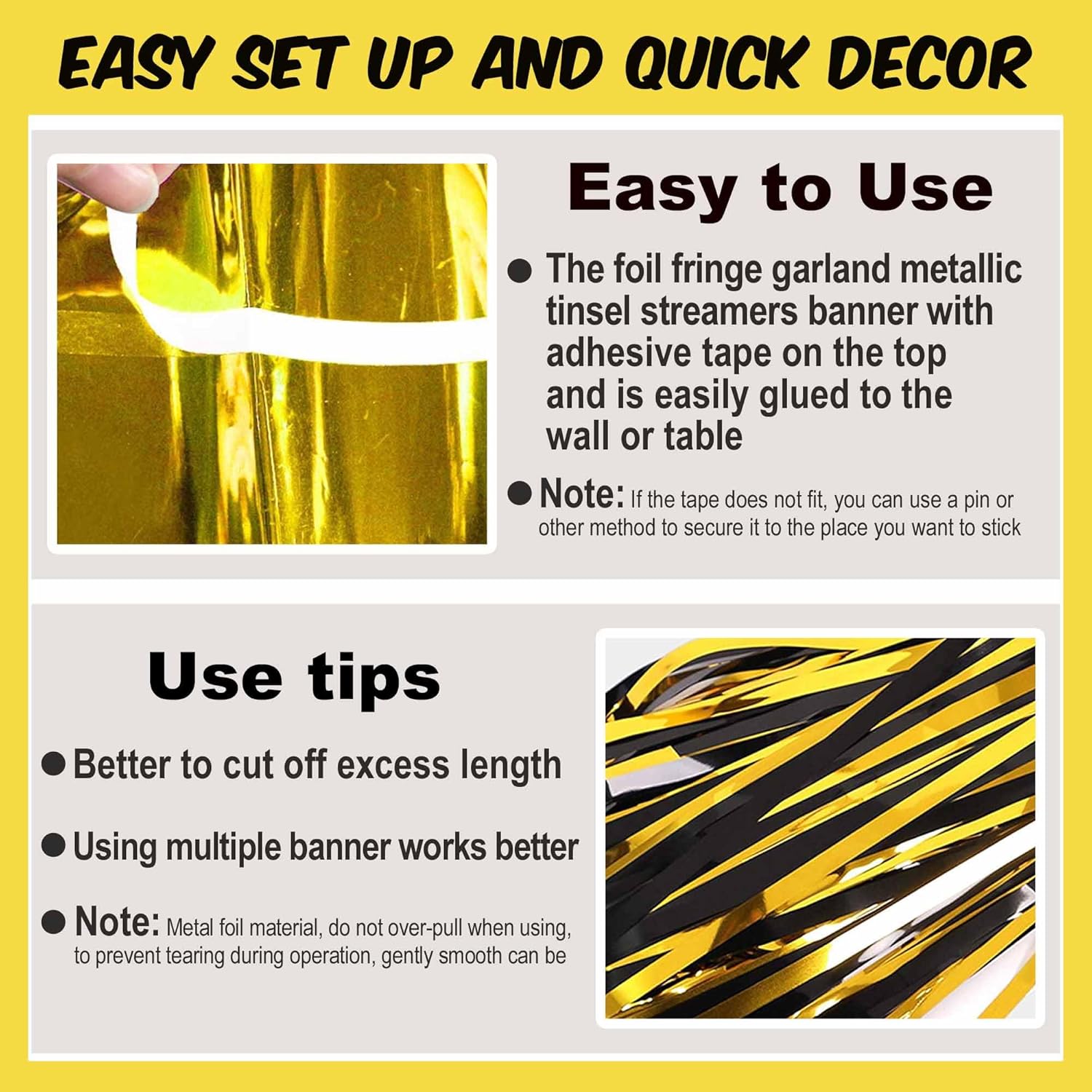 - Easy to Use: Tinsel foil fringe garland banner streamers the back has double-sided tape, gently peel double-sided tape off and it would be very easy to paste on wall, window, table, door, parade float or anywhere you want to decorate, add some festive atmosphere to the party